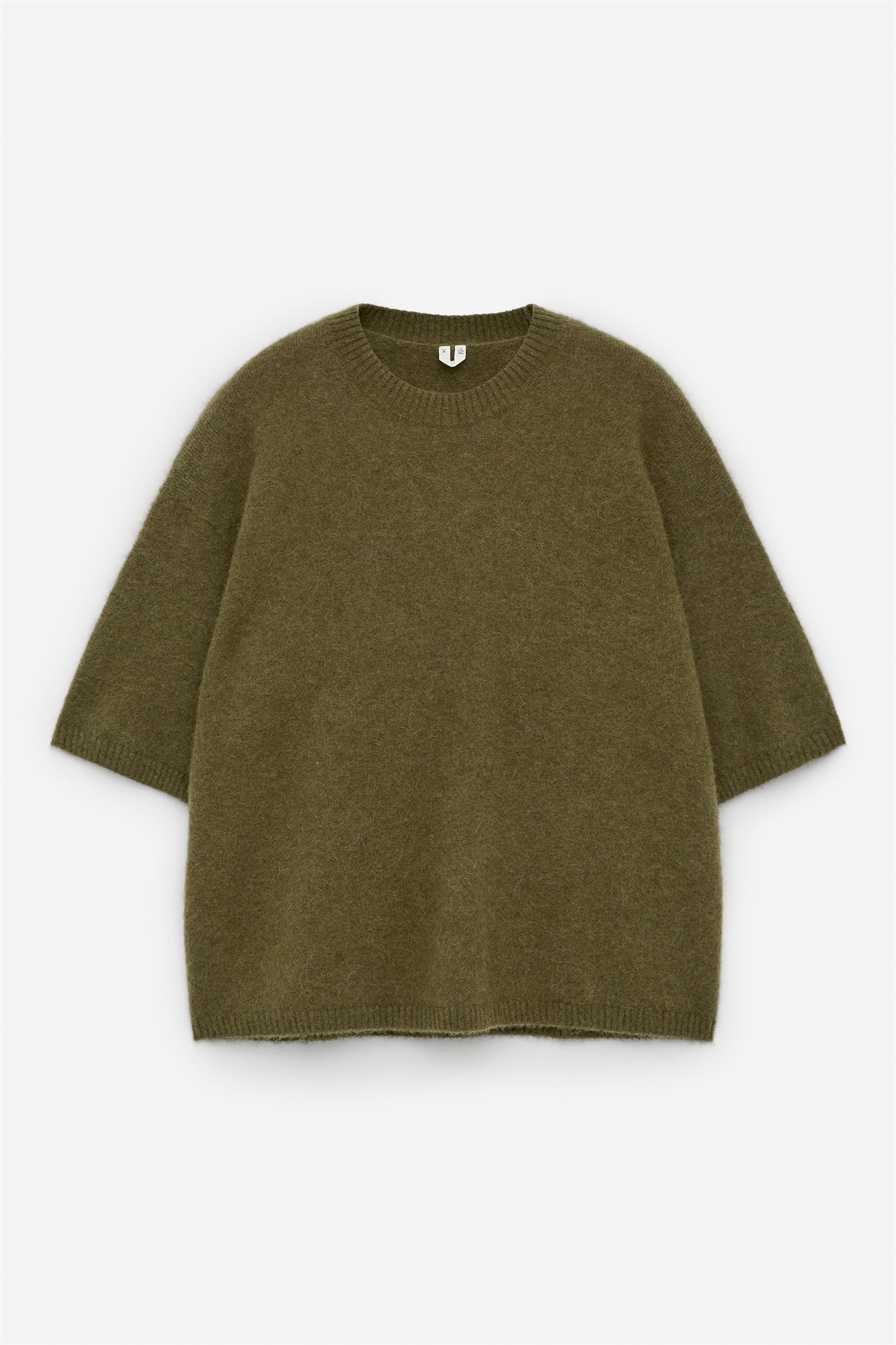 Джемпер с короткими рукавами из комфортной смеси альпака и шерсти. Модель имеет круглый вырез и свободный крой. Ребристая отделка завершает образ. Джемпер изготовлен из 31% шерсти, сертифицированной по стандарту RWS (TE-00047206). Продукция, сертифицированная в соответствии со стандартом ответственной шерсти (RWS), содержит шерстяные волокна с ферм, прошедших независимую сертификацию в соответствии с требованиями к благополучию животных и землепользованию.