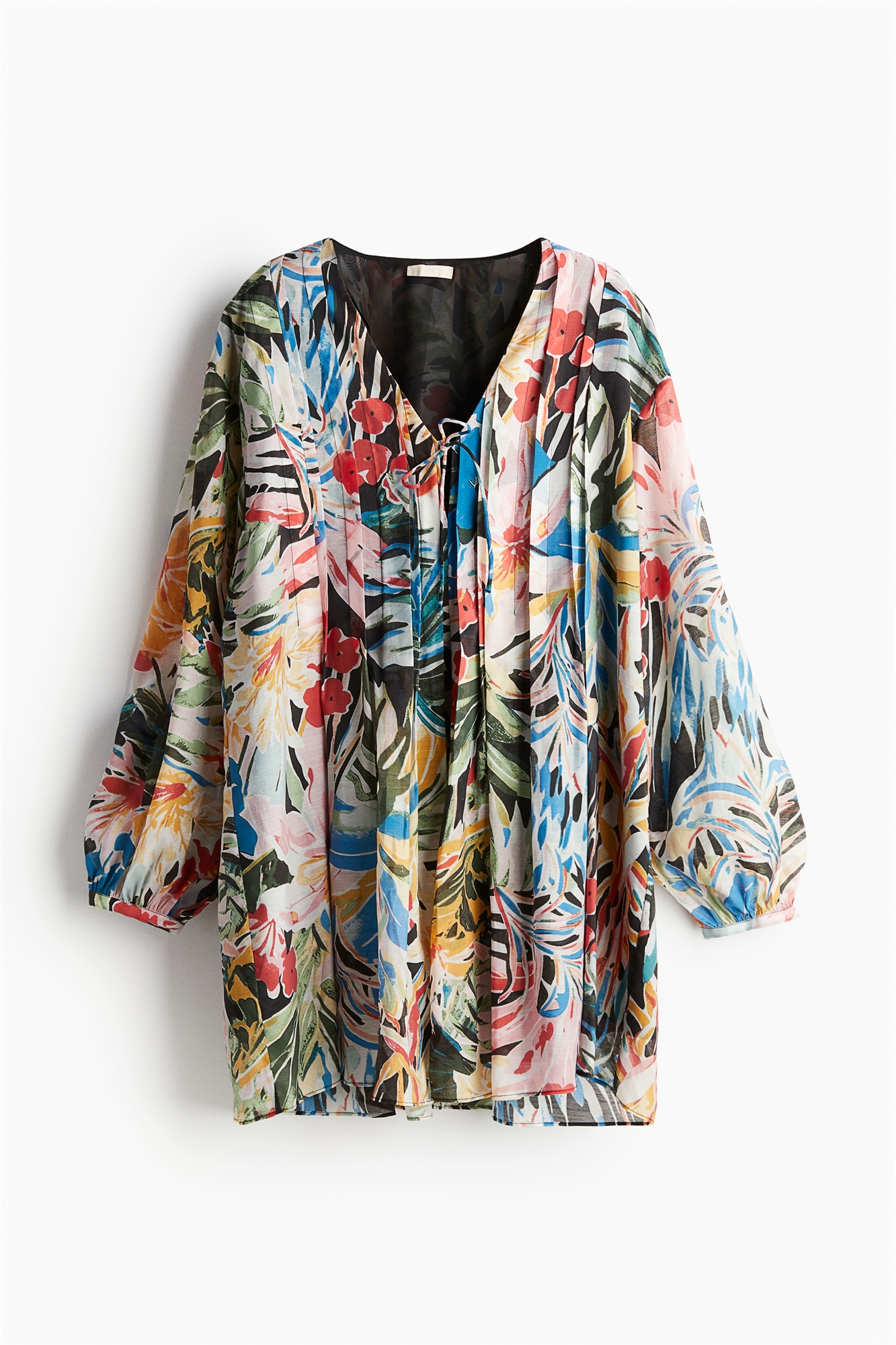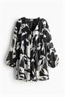 Короткое платье из полотняного переплетения с V-образным вырезом и проймой с завязками-спагетти спереди. Свободный крой с пинтами спереди и сзади, слегка спущенные плечи и длинные объемные рукава с разрезом и узкими манжетами на пуговицах. Частично на подкладке.