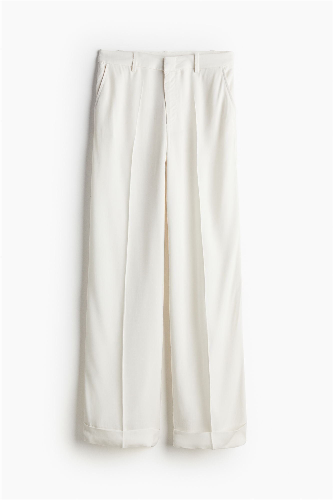 Приталенные брюки из вискозной саржи с заниженной талией, ширинкой на молнии и скрытыми застежками на пуговицах и крючках. Диагональные боковые карманы и втачные карманы сзади. Прямые ноги со складками спереди и сзади и пришитым оборотом на подоле.