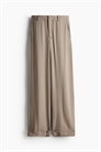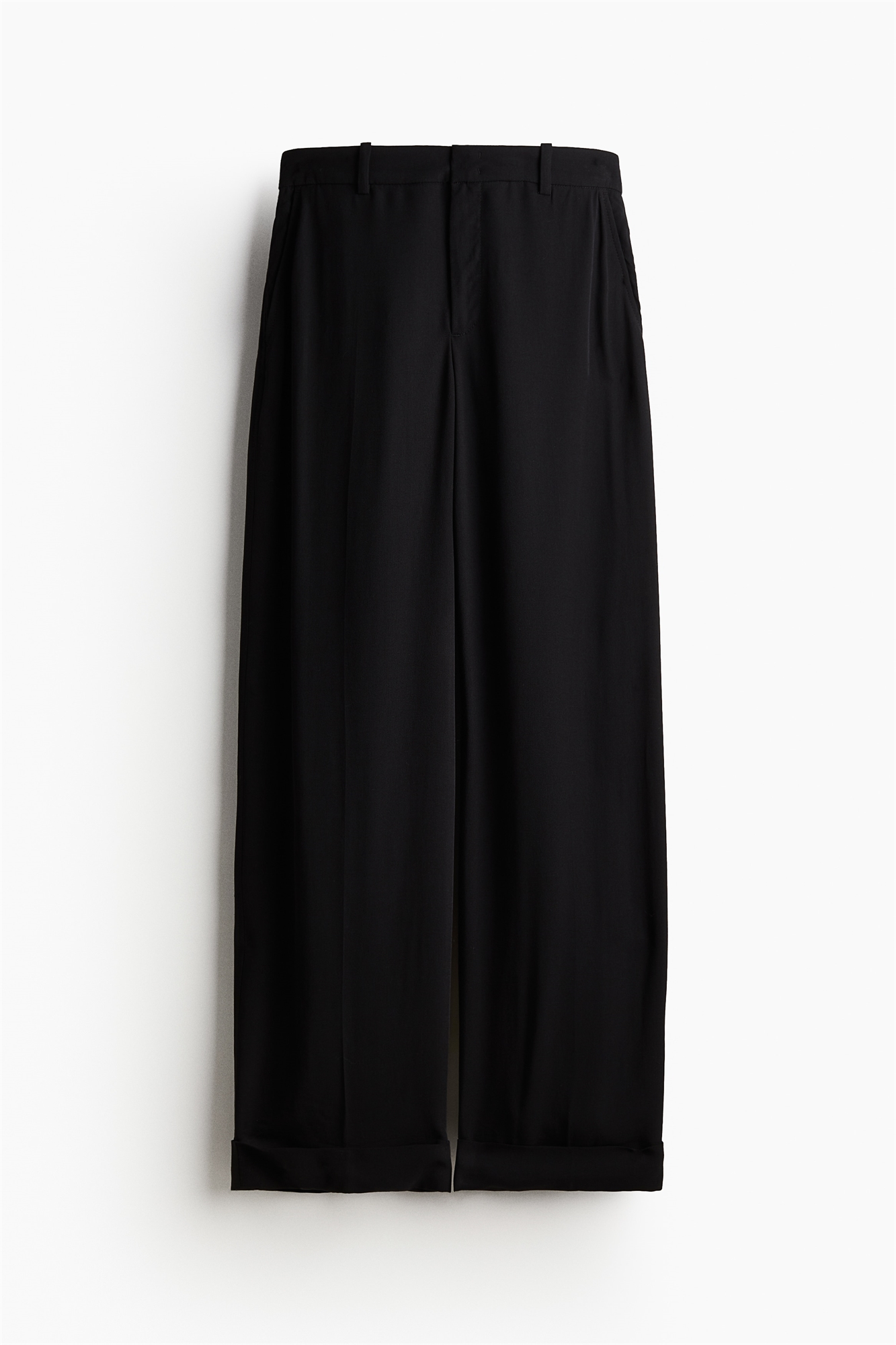 Приталенные брюки из вискозной саржи с заниженной талией, ширинкой на молнии и скрытыми застежками на пуговицах и крючках. Диагональные боковые карманы и втачные карманы сзади. Прямые ноги со складками спереди и сзади и пришитым оборотом на подоле.