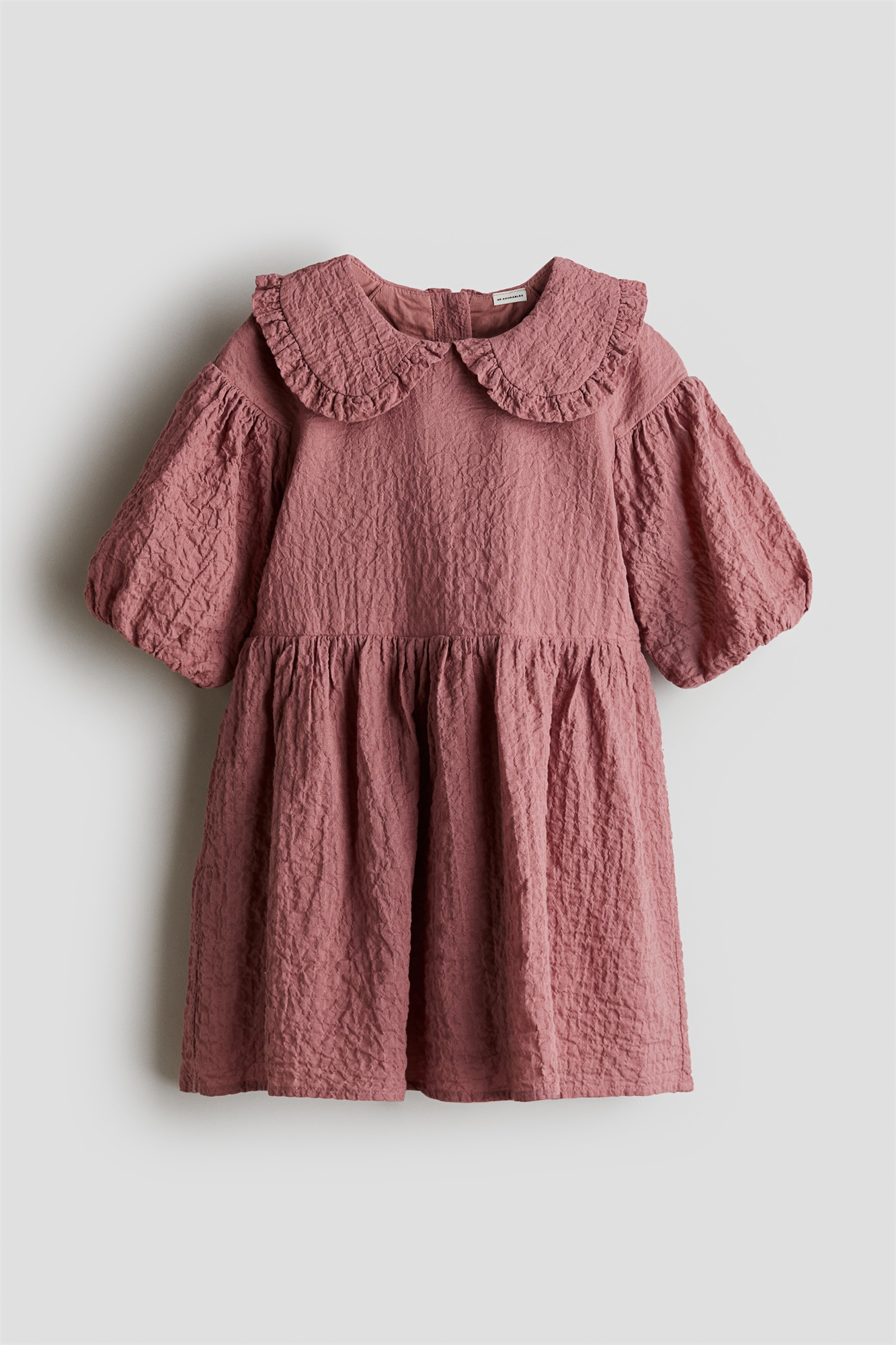 H&M Adorables. Платье из мягкого, воздушного трикотажа из высококачественного хлопка с расклешенной юбкой. Круглый вырез с воротником с оборками и застежкой на пуговицы сзади. Короткие пышные рукава, спущенные плечи и сборчатый шов на талии. Подкладка из хлопкового поплина. Коллекция H&M Adorables - это подборка удобных и качественных вещей, не теряющих актуальности.