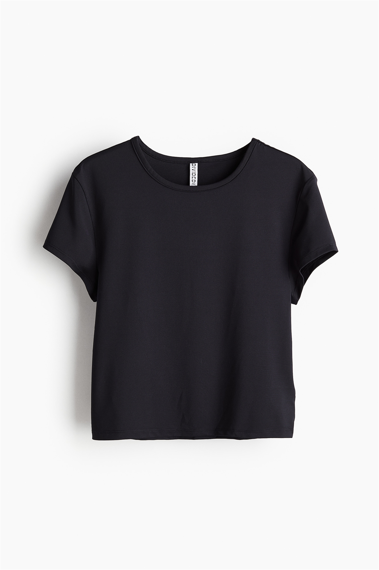 Короткая, облегающая фигуру футболка из эластичного джерси. Круглый вырез с узкой окантовкой и прямой подол.
