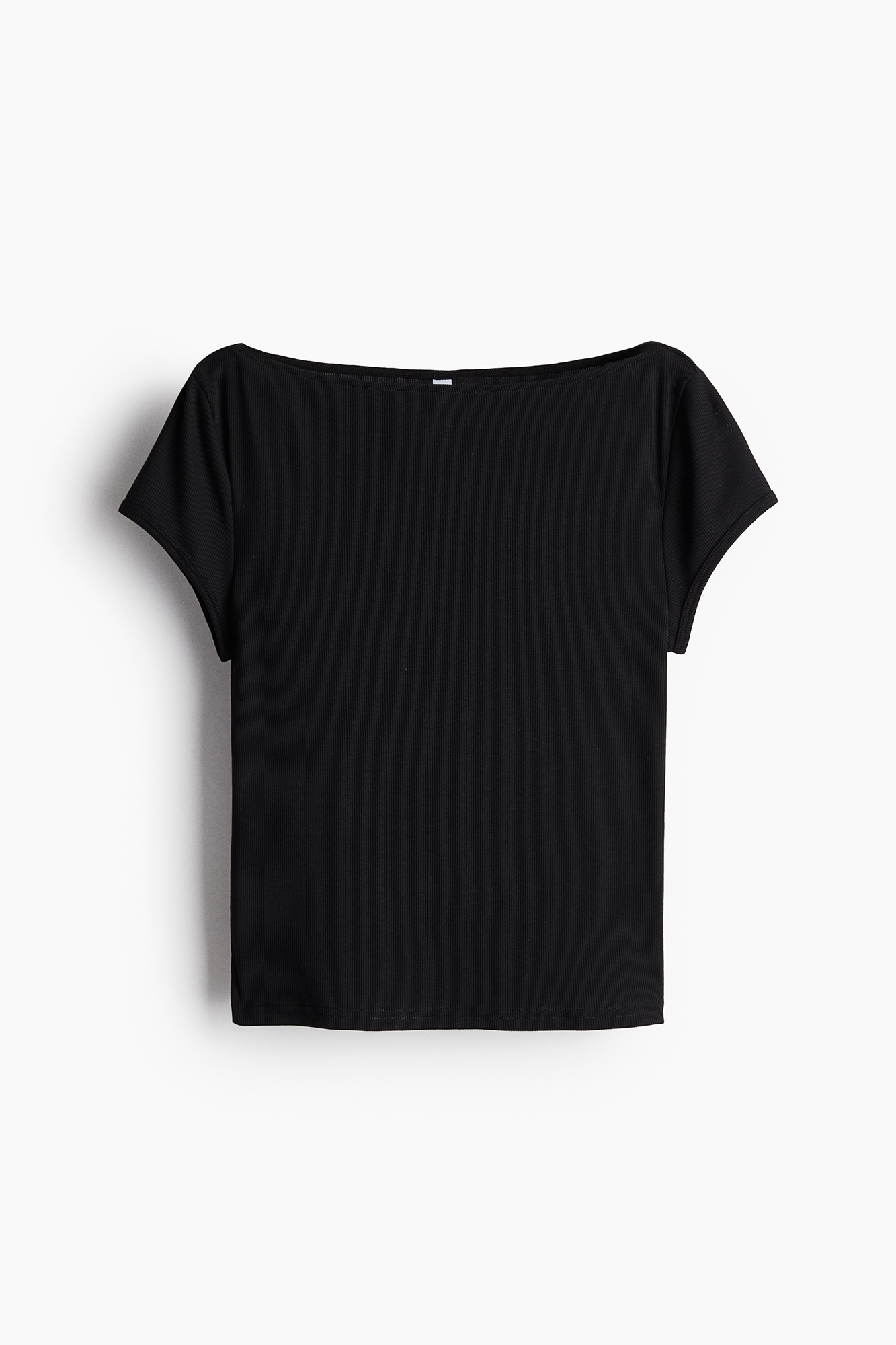 Короткая, приталенная футболка из гладкого ребристого трикотажа с нежным вырезом-лодочкой и прямым покроем.