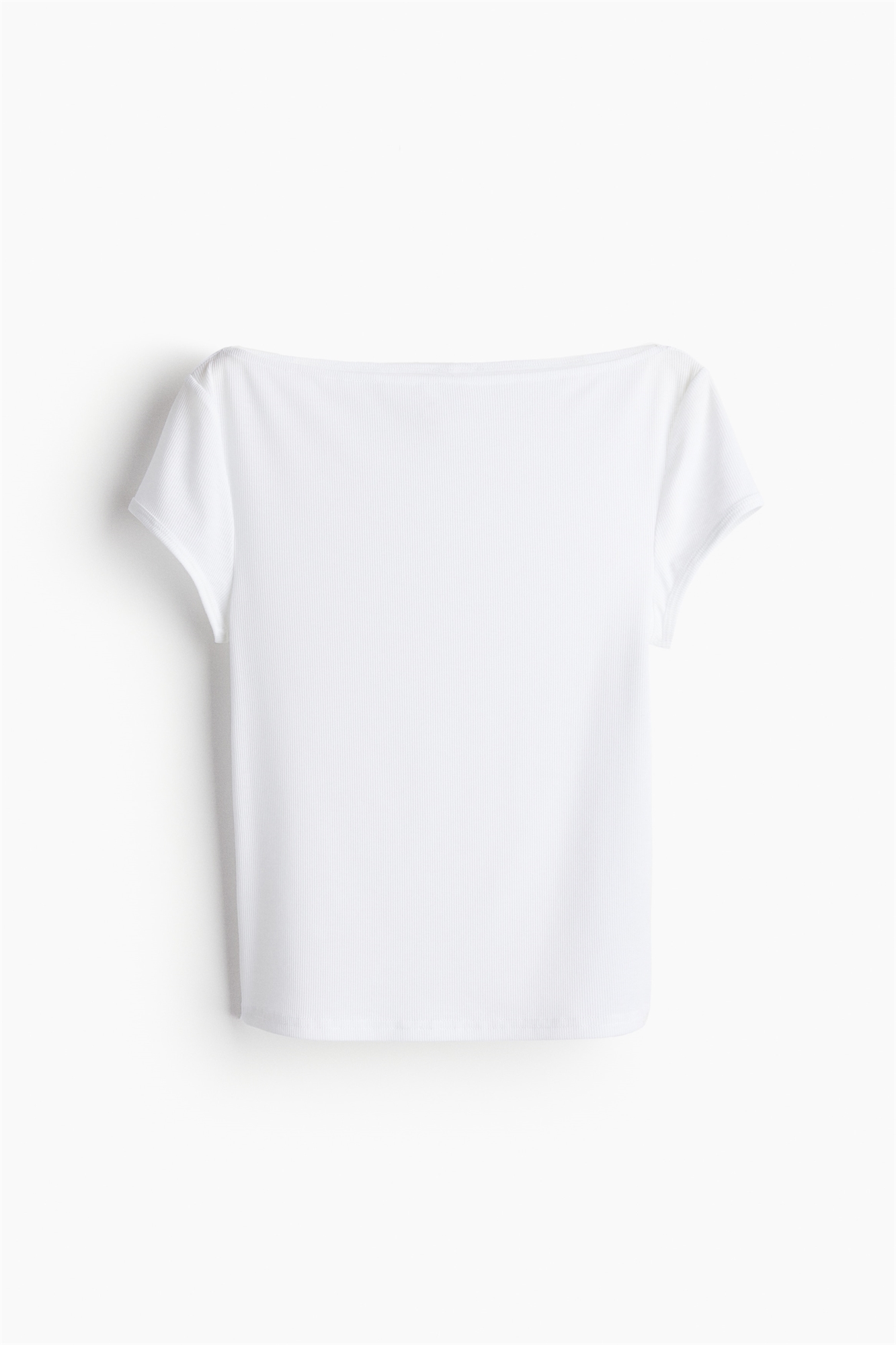 Короткая, приталенная футболка из гладкого ребристого трикотажа с нежным вырезом-лодочкой и прямым покроем.