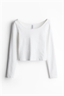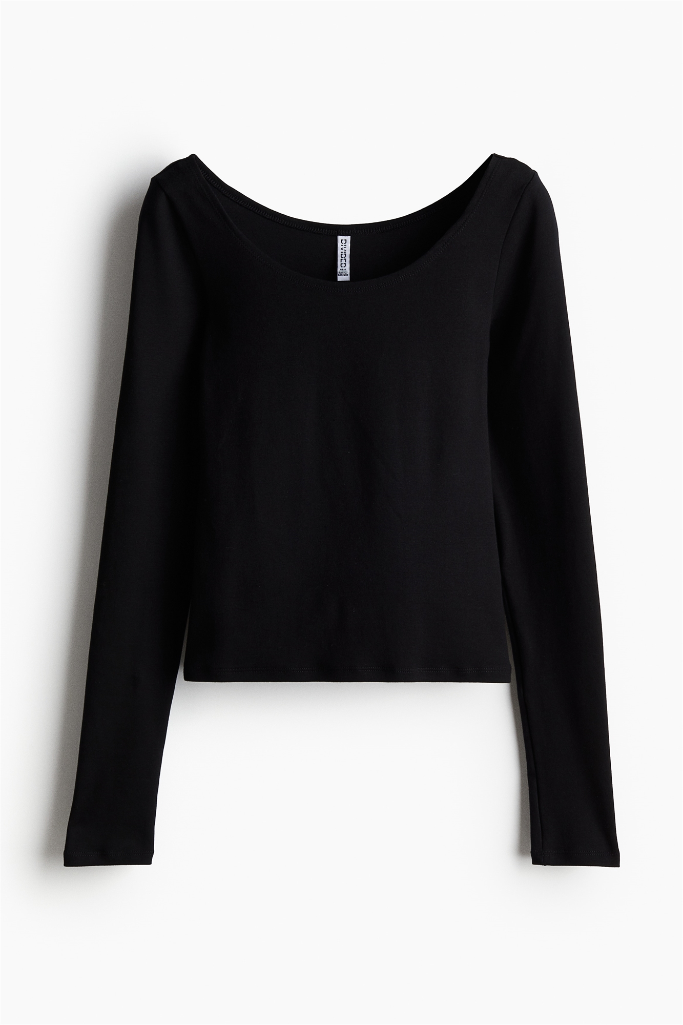 Короткая, облегающая фигуру рубашка из мягкого хлопкового джерси с вырезом-лодочкой, длинными рукавами и прямым подолом.