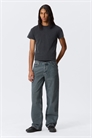 Джинсы с низкой посадкой, свободным кроем, прямыми штанинами и удлиненной длиной. Джинсы изготовлены из жесткого денима из органического хлопка с добавлением переработанного хлопка. Они имеют классический дизайн с 5 карманами и застежку на пуговицу.