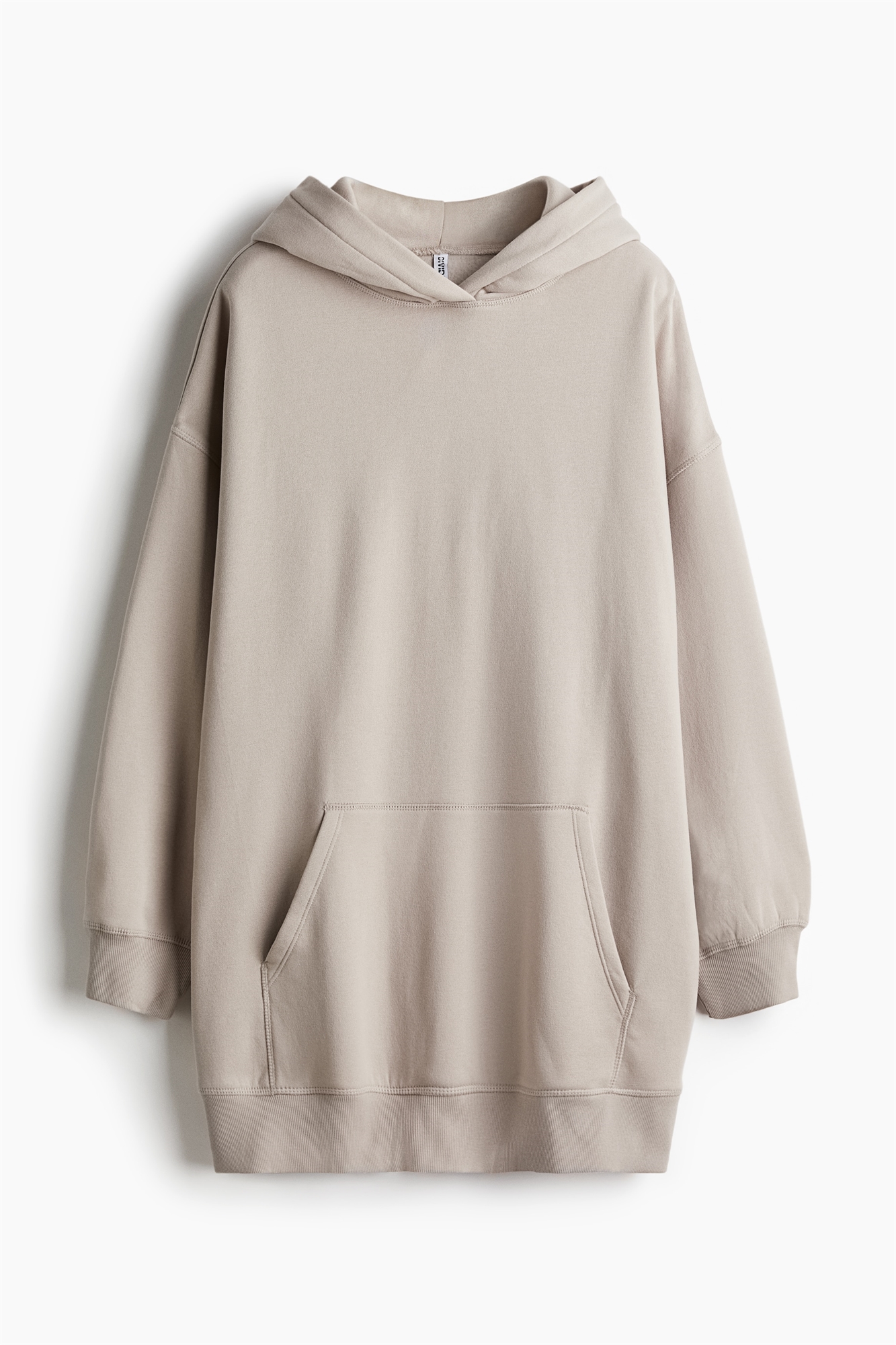 Короткое платье большого размера из легкой толстовочной ткани из смеси хлопка. Большой двухслойный капюшон с откидным верхом. Карман-кенгуру, спущенные плечи, длинные рукава, манжеты и подол в рубчик. Без подкладки.