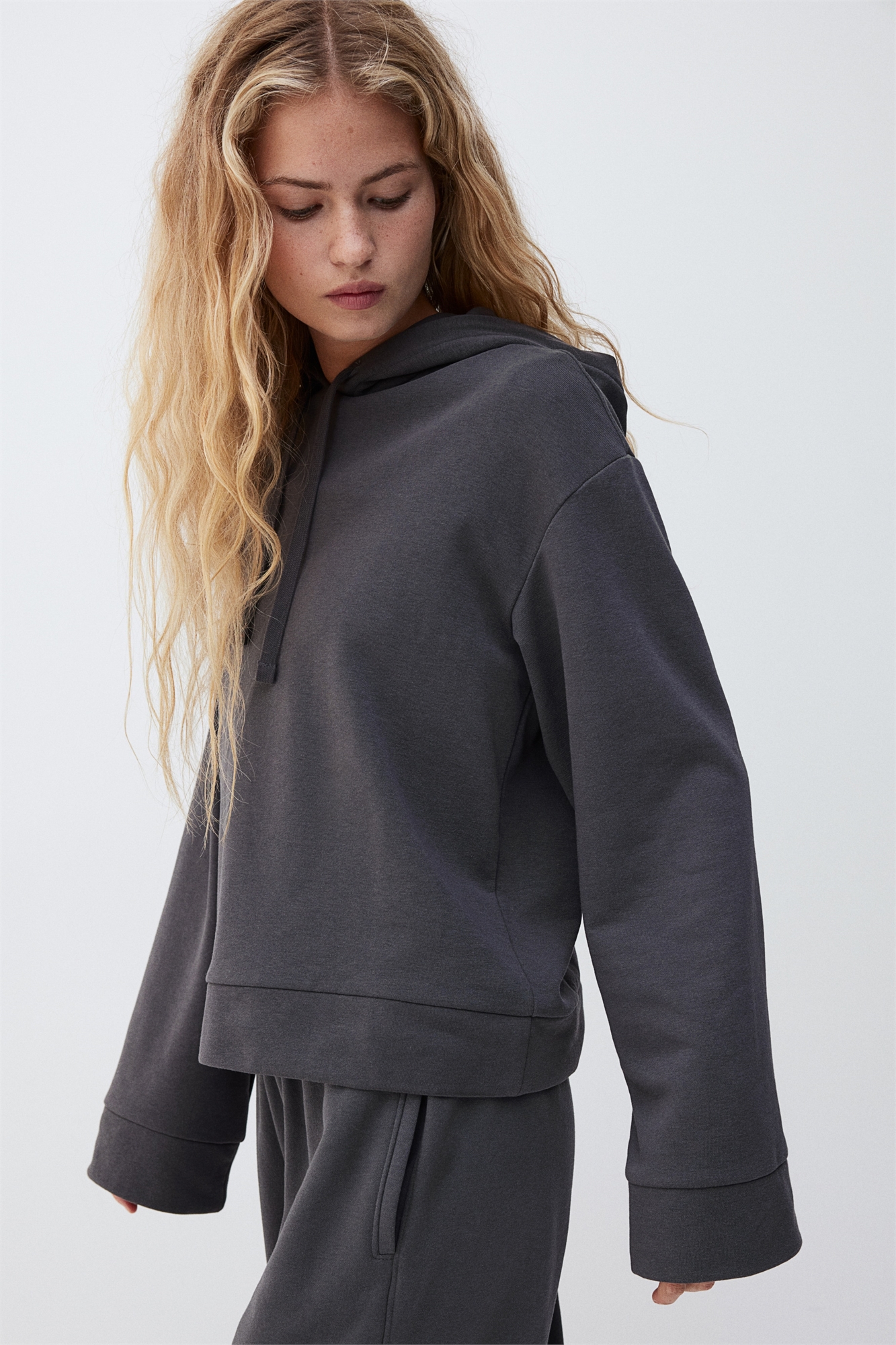 Толстовка из мягкого трикотажа с капюшоном на завязках, спущенными плечами и длинными широкими рукавами.