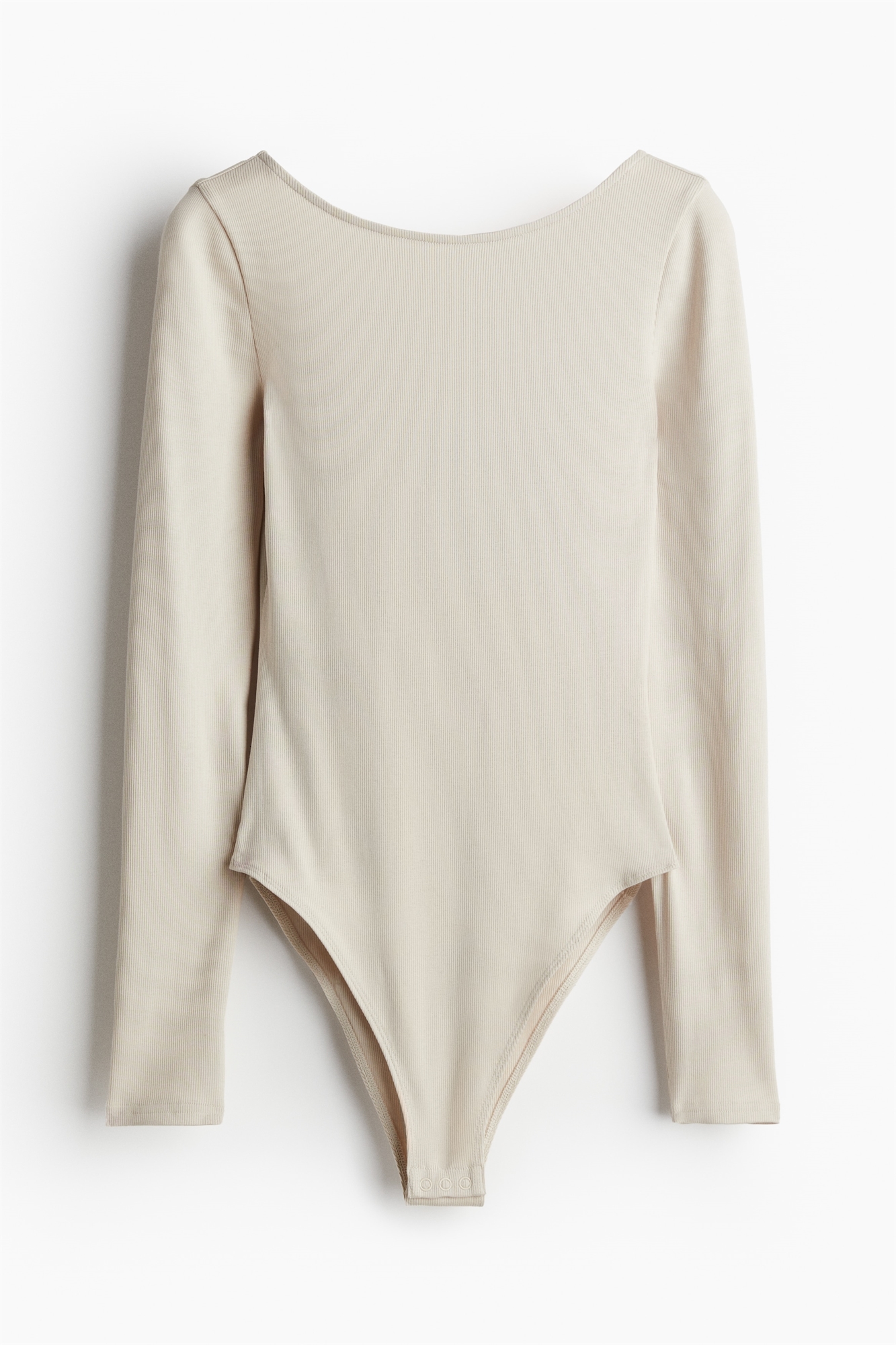 Боди с длинными рукавами из ребристого хлопкового джерси с вырезом-лодочкой спереди, завязками на спине и кнопками в области промежности.
