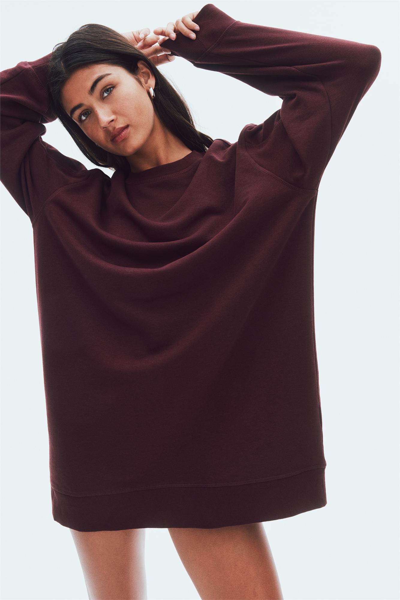 Короткое платье из легкой толстовочной ткани с швами flatlock для дополнительного комфорта. Свободный крой с круглым вырезом в рубчик, спущенными плечами и длинными рукавами. Ребристые манжеты и подол.