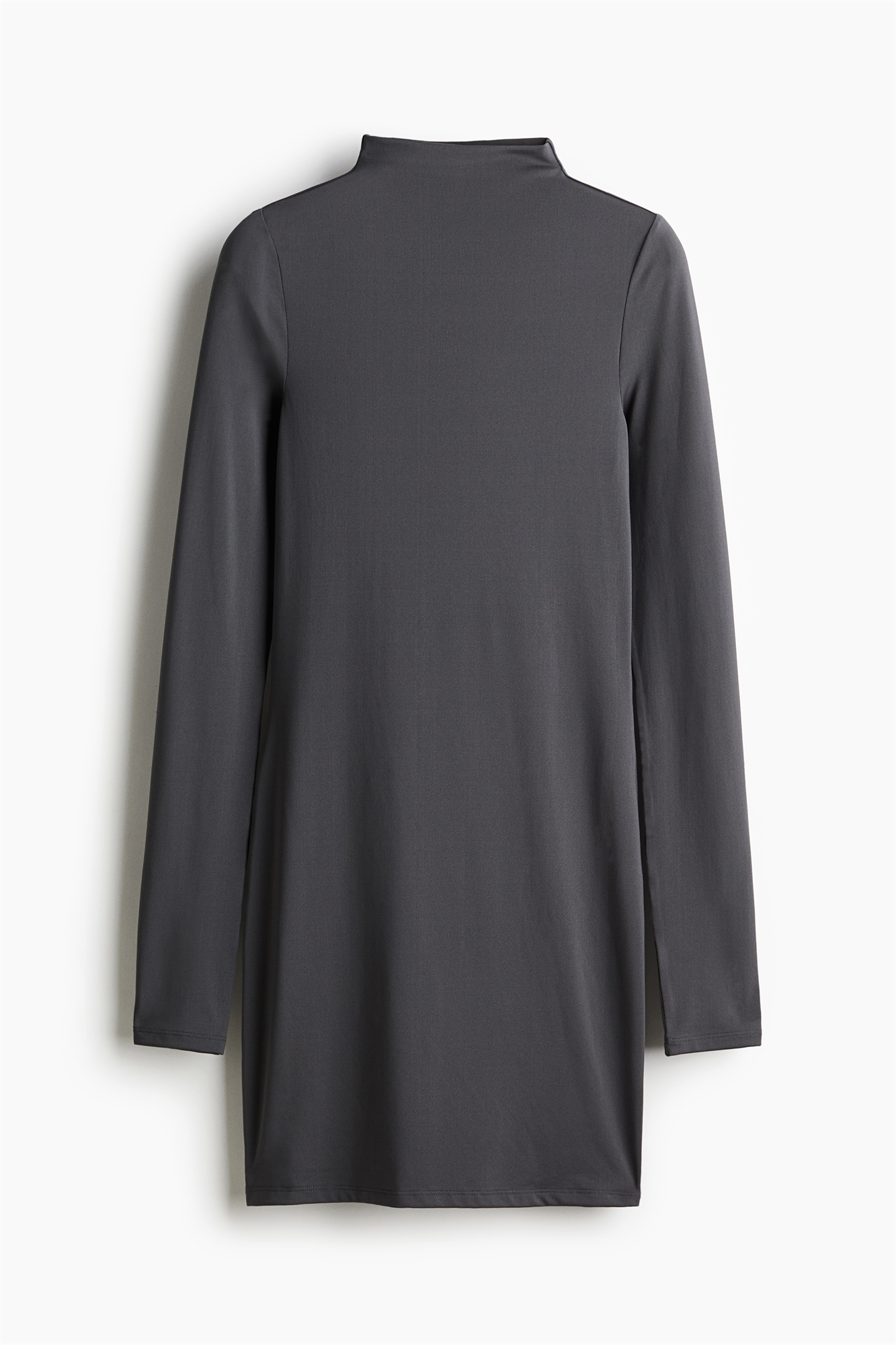 Облегающее мини-платье из эластичного трикотажа с легким блеском. Черепаховая горловина, длинные рукава и прямой подол.