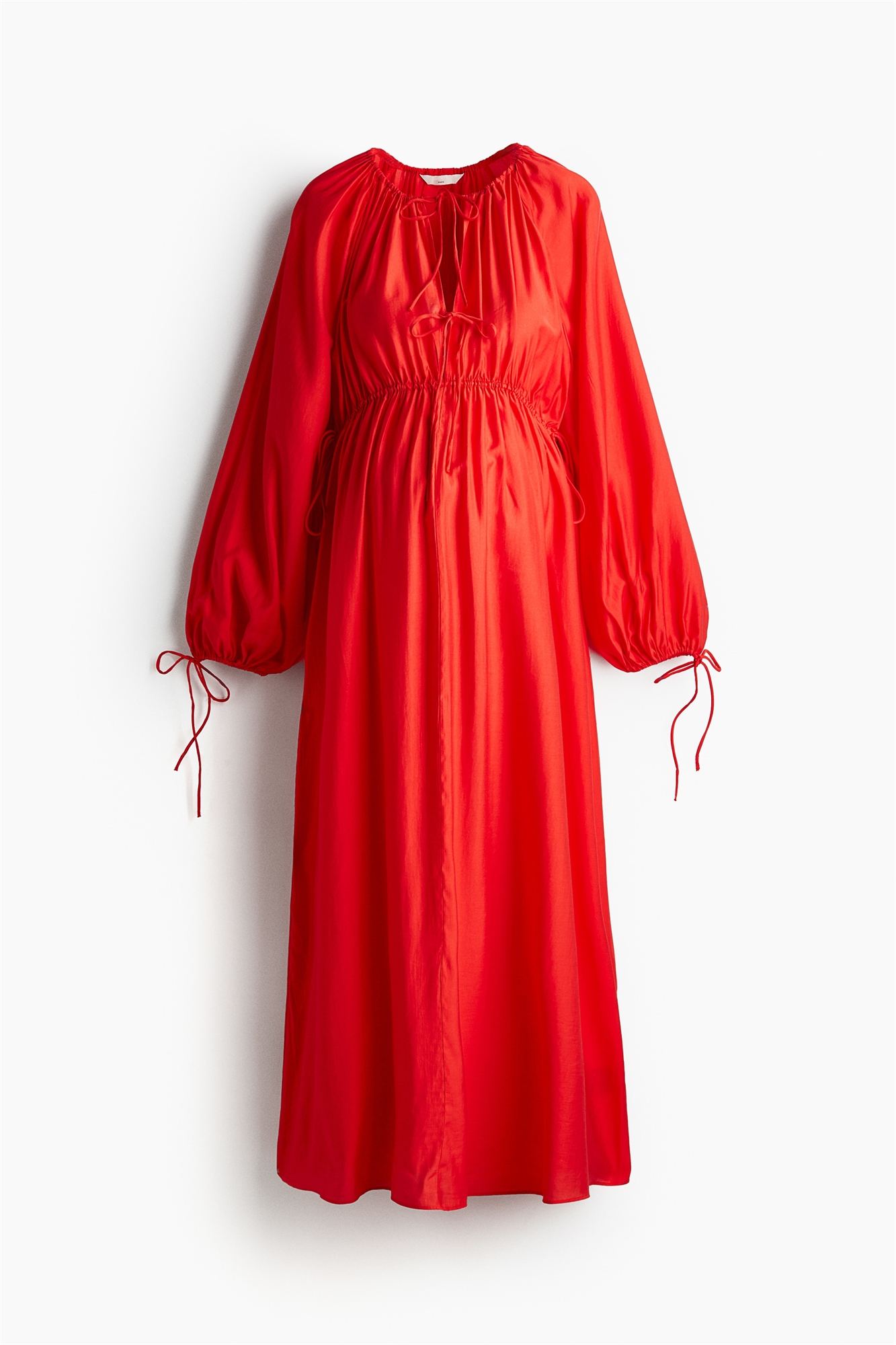 Платье длиной до щиколоток из тканого материала с круглым вырезом на завязках и V-образной проймой с узкими завязками-спагетти спереди. Свободный крой с длинными рукавами реглан, дополненными завязками-спагетти на манжетах. Завязки на талии с завязками по бокам и слегка расклешенная юбка. Без подкладки.