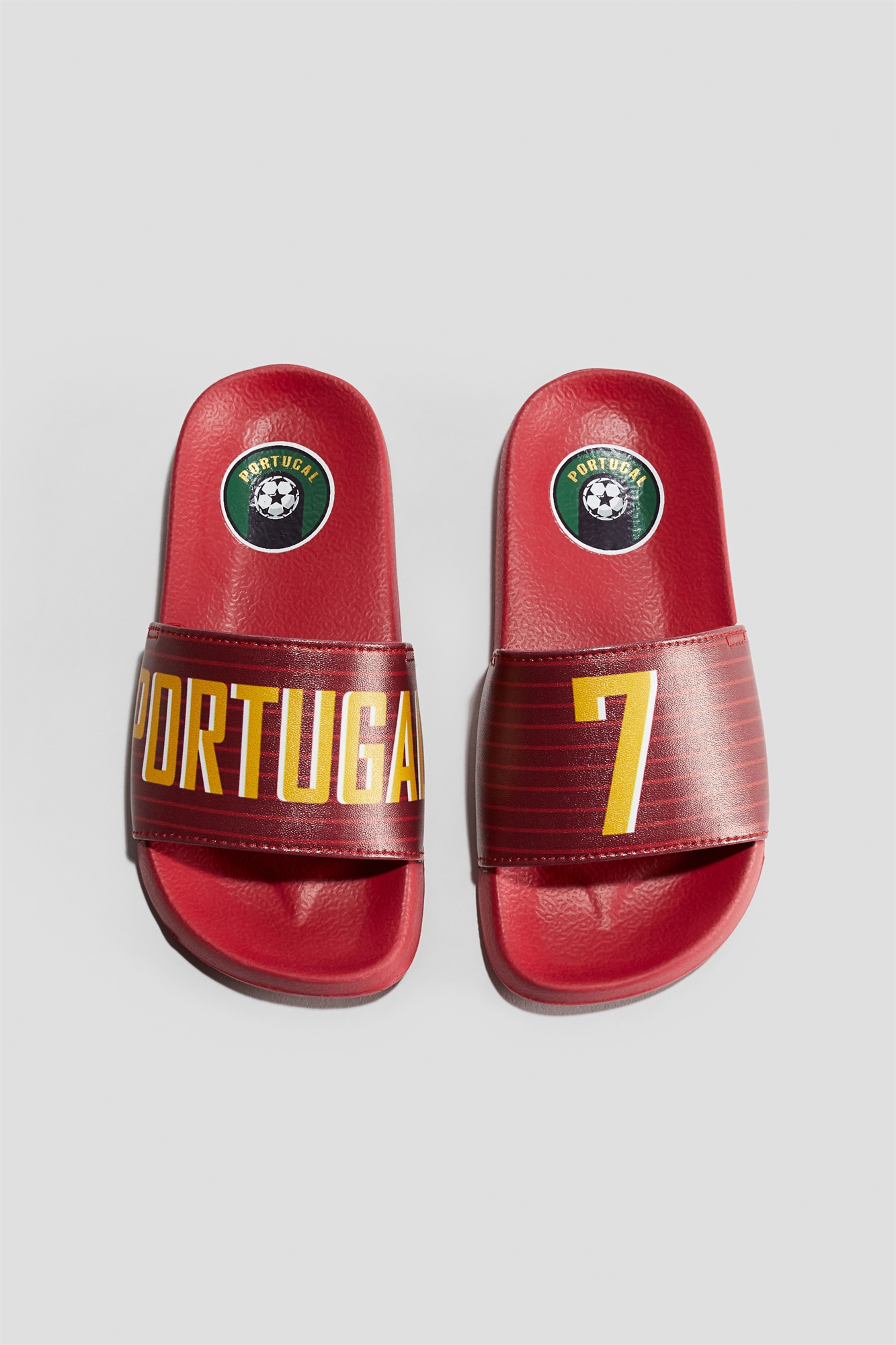 Туфли для бассейна с мягким ремешком для ног, украшенные принтом на футбольную тематику. Формованная подошва с рифленой поверхностью. Размеры 7-9,5 с эластичным ремешком на пятке. Высота подошвы 2,5 см.