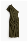 Платье длиной до колен, с одним коротким рукавом, потайной застежкой-молнией с одной стороны и сборчатым швом с другой стороны для мягкой драпировки лифа. Приталенная юбка с рюшами, заканчивающаяся высоким разрезом спереди. Без подкладки.