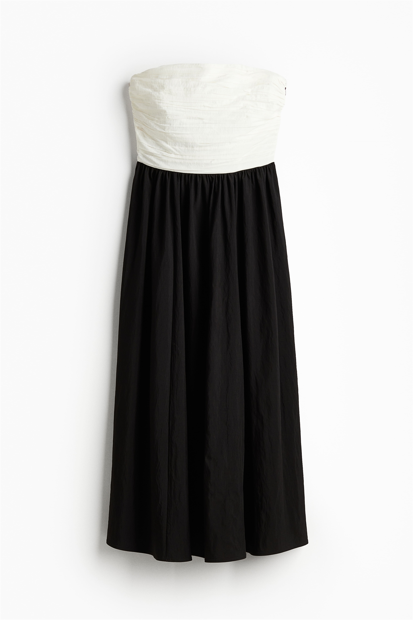 Платье-бандо длиной до колен из тканого материала. Облегающий плиссированный лиф с платочной вставкой сзади и потайной застежкой-молнией с одной стороны. Присборенный шов на талии и расклешенная юбка. Лиф на подкладке.