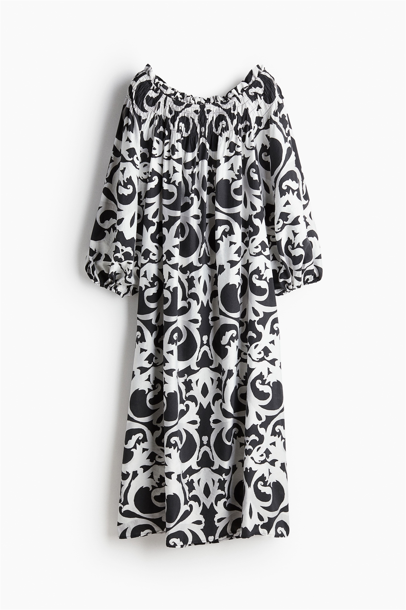 Длинное платье без плеч из тканого материала с широким швом и узкой оборкой в верхней части. Силуэт оверсайз и длинные рукава-баллон с эластичными манжетами. Без подкладки.