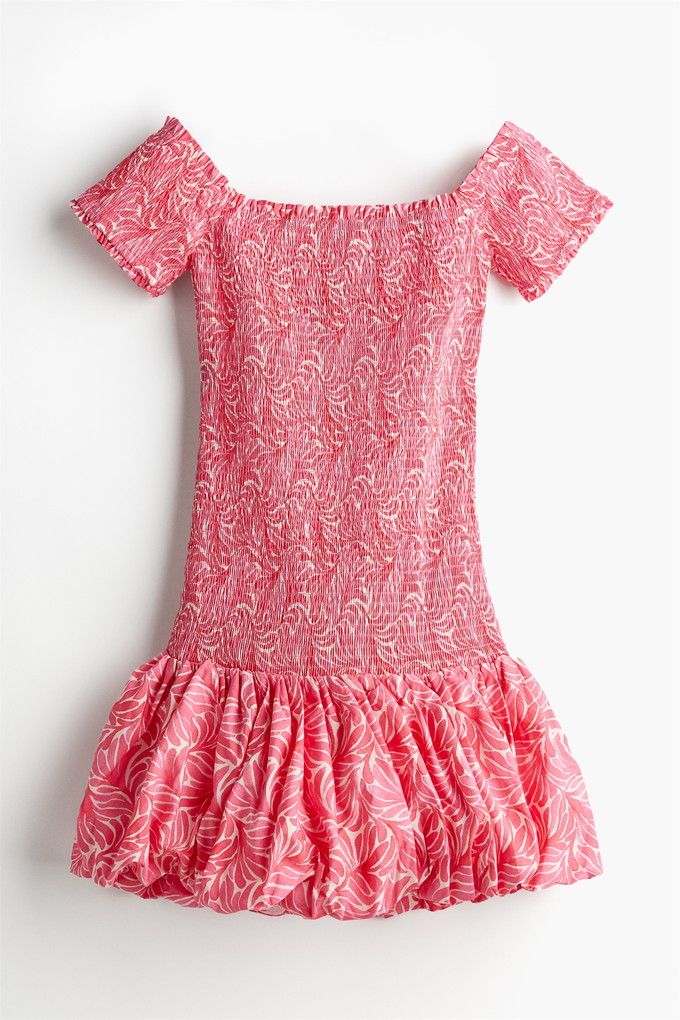 Короткое приталенное платье без плеч из поплина со швом, с короткими рукавами и небольшой оборкой по верху и манжетам. Юбка с пузырчатым подолом создает пышный силуэт.