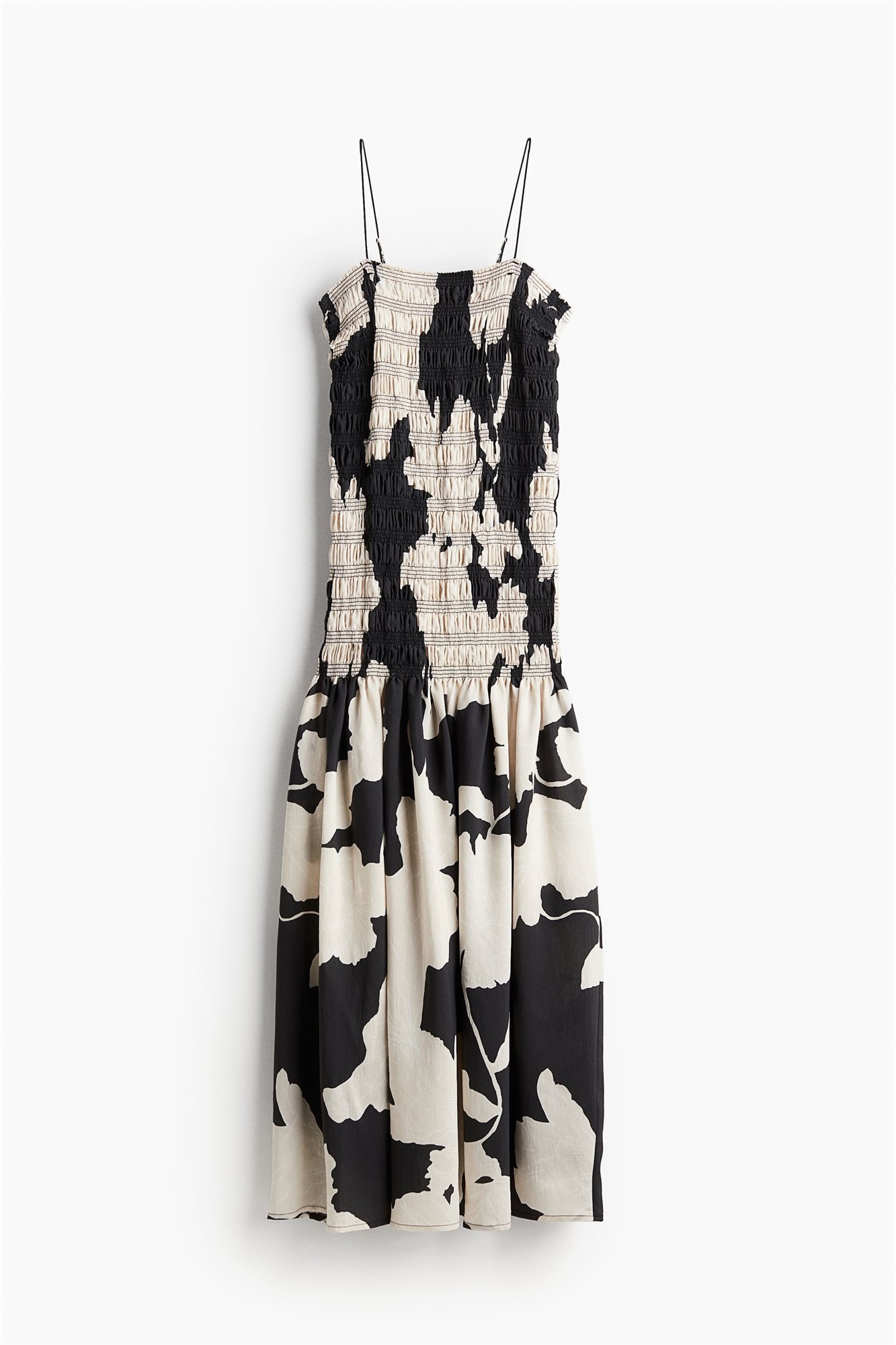 Длинное платье из тканого материала с вышивкой по лифу и на бедрах. Прямой крой в верхней части с небольшой оборкой, регулируемые бретели-спагетти и расклешенная юбка. Без подкладки.