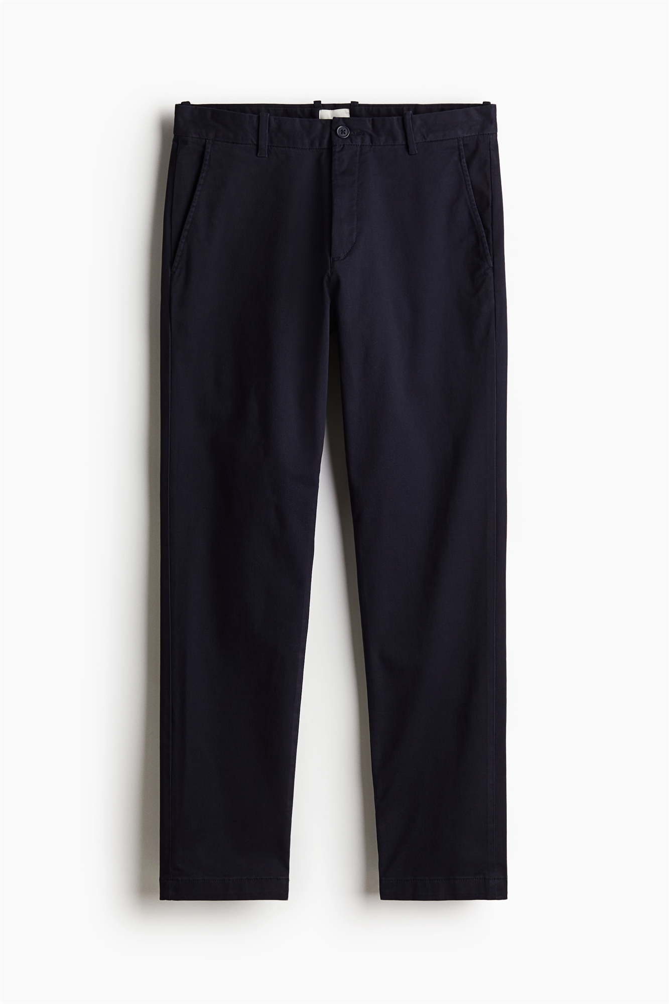Чиносы из эластичной хлопковой саржи с ширинкой на молнии и пуговице, диагональными боковыми карманами и накладными задними карманами на пуговице. Зауженный крой, облегающий контуры тела и создающий приталенный силуэт.