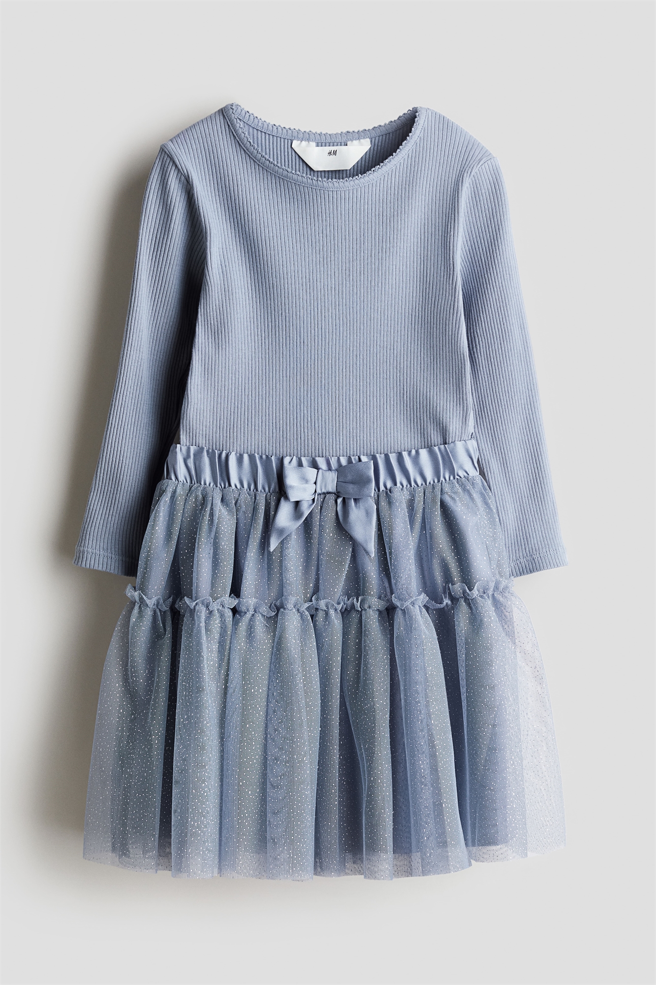 Комплект из двух частей: топ и юбка из тюля. Топ с длинными рукавами из ребристого, мягкого хлопкового джерси с круглым вырезом, отделанным пико. Юбка из двухслойного тюля с принтом из блесток и эластичным поясом с аппликацией спереди. Вдоль талии обработанный оборками шов для придания дополнительного объема. На подкладке.