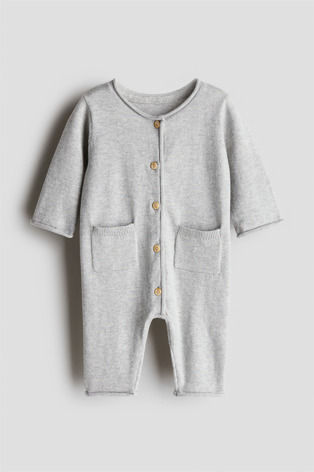 Костюм-ромпер с длинными рукавами из тонкого хлопкового трикотажа с круглым вырезом и пуговицами под дерево спереди. Накладные передние карманы и длинные ноги. Окантовка по вырезу горловины, манжетам и кайме.