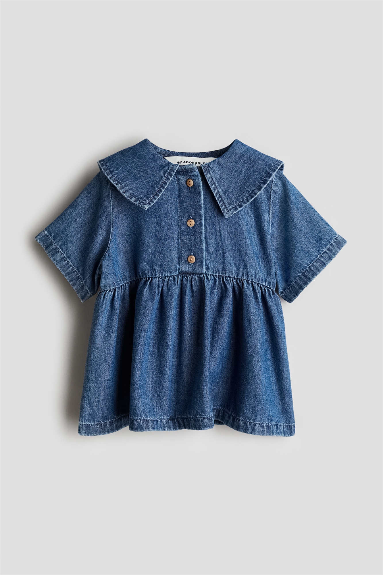 H&M Adorables. Платье с короткими рукавами из мягкого денима, изготовленного из лиоцелла и высококачественного хлопка. Платье имеет матросский воротник и застежку на удобные прочные пуговицы corozo. Собранный шов на талии и расклешенная юбка. Коллекция H&M Adorables - это подборка удобных и качественных вещей, не теряющих актуальности.