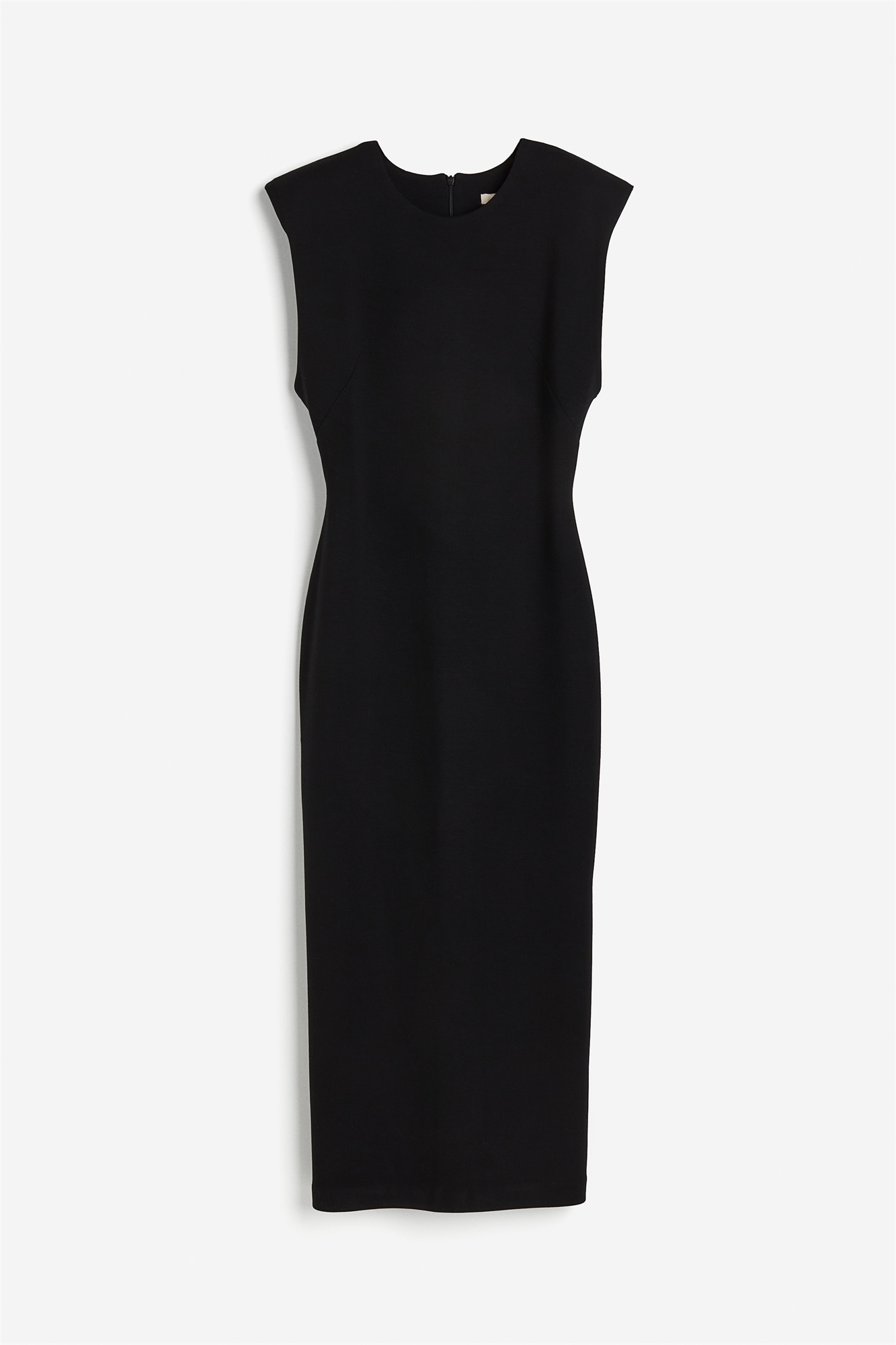 Приталенное платье из джерси длиной до колен с круглым вырезом и потайной застежкой-молнией сзади. Модель без рукавов с толстыми подплечниками для придания силуэту выразительности.