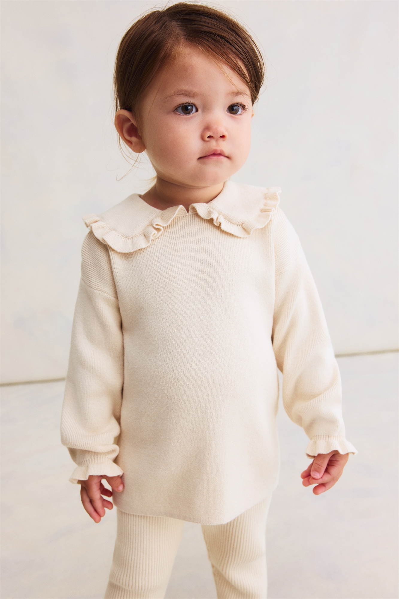 H&M Adorables. Комплект из джемпера и леггинсов мягкой вязки в рубчик из высококачественного хлопка. Джемпер с длинными рукавами, круглым вырезом, воротником с оборкой, спущенными плечами и оборчатыми манжетами. Леггинсы с регулируемой эластичной талией. Коллекция H&M Adorables - это подборка удобных и качественных вещей, не теряющих актуальности.