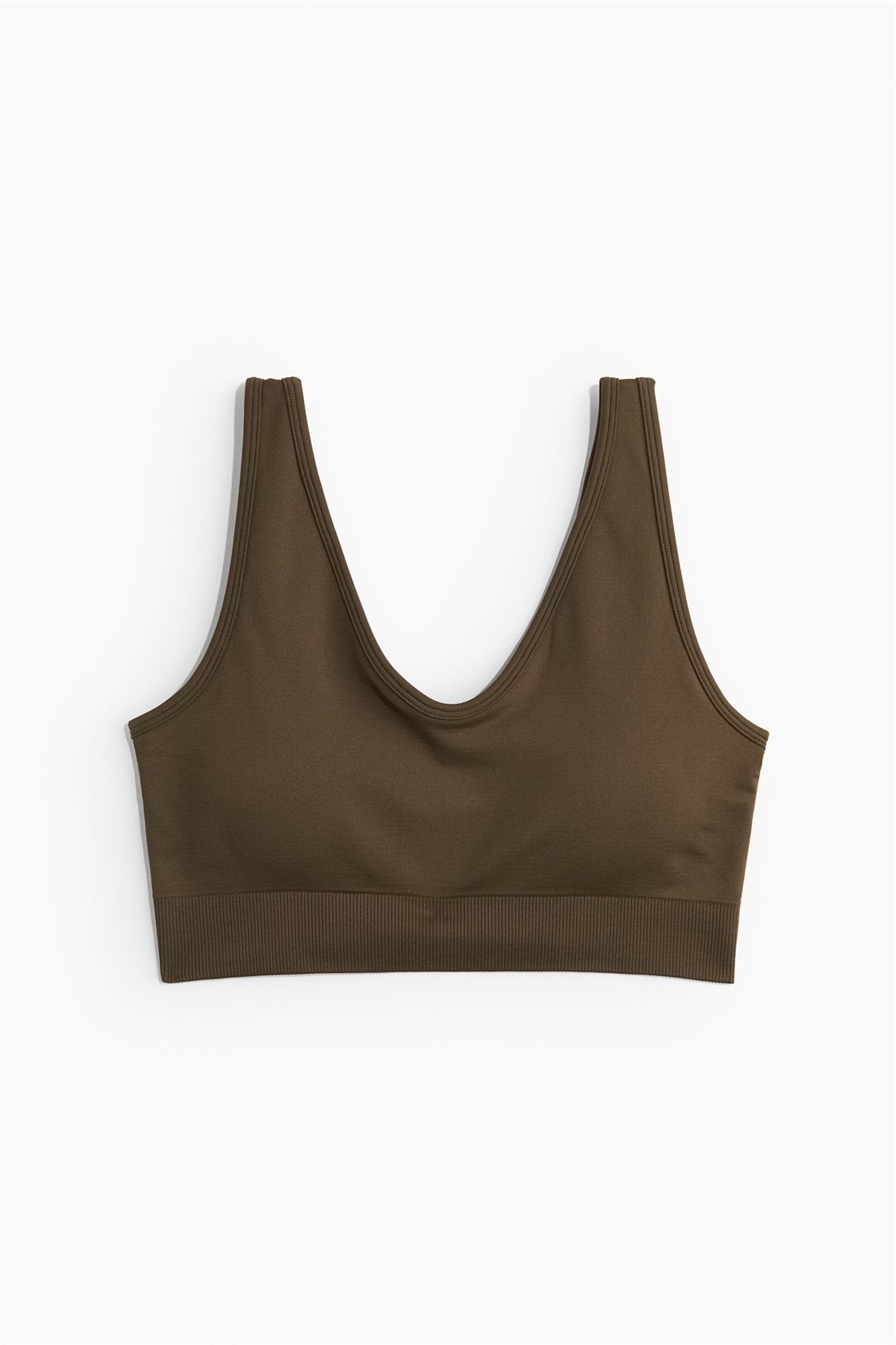 Спортивный бюстгальтер из ребристого джерси с бретелями, круглым вырезом, чашечками на подкладке со съемными вкладышами для регулировки посадки и придания формы бюсту, а также широким ребристым подолом. Легкая поддержка, подходящая для тренировок низкой интенсивности. Бюстгальтер имеет минимальное количество швов для более комфортной посадки и повышенной подвижности.