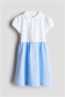 Школьное платье из хлопкового джерси с юбкой из хлопкового полотна в клетку. Ребристый воротник с гребешковыми краями, застежка на пуговицах, короткие пышные рукава и сборка на талии. Без подкладки.