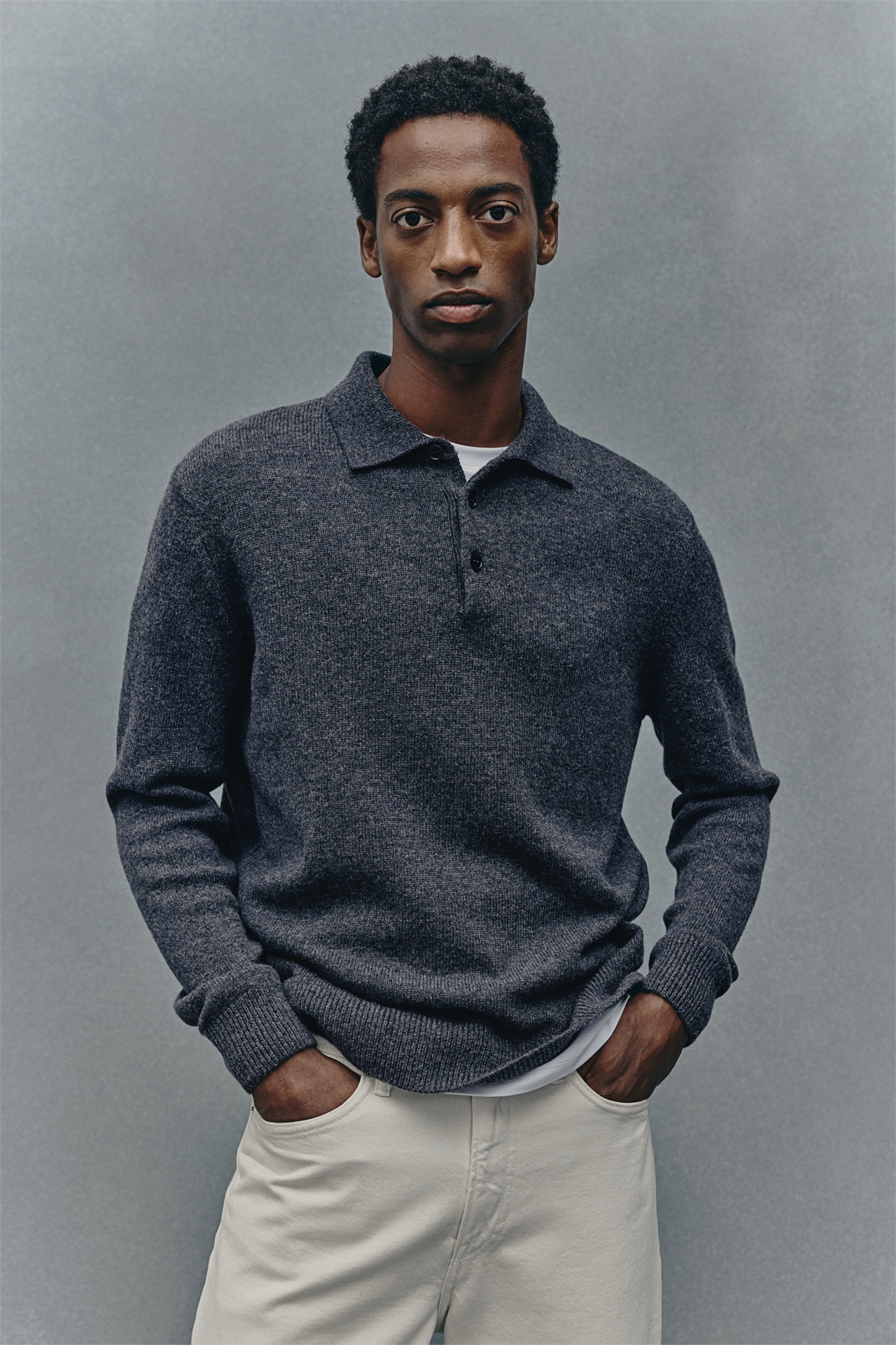 Джемпер-поло из мягкой шерсти тонкой вязки с воротником, застежкой на пуговицы и длинными рукавами. Манжеты и подол отделаны резинкой. Регулярный крой для комфортной носки и классического силуэта.