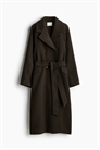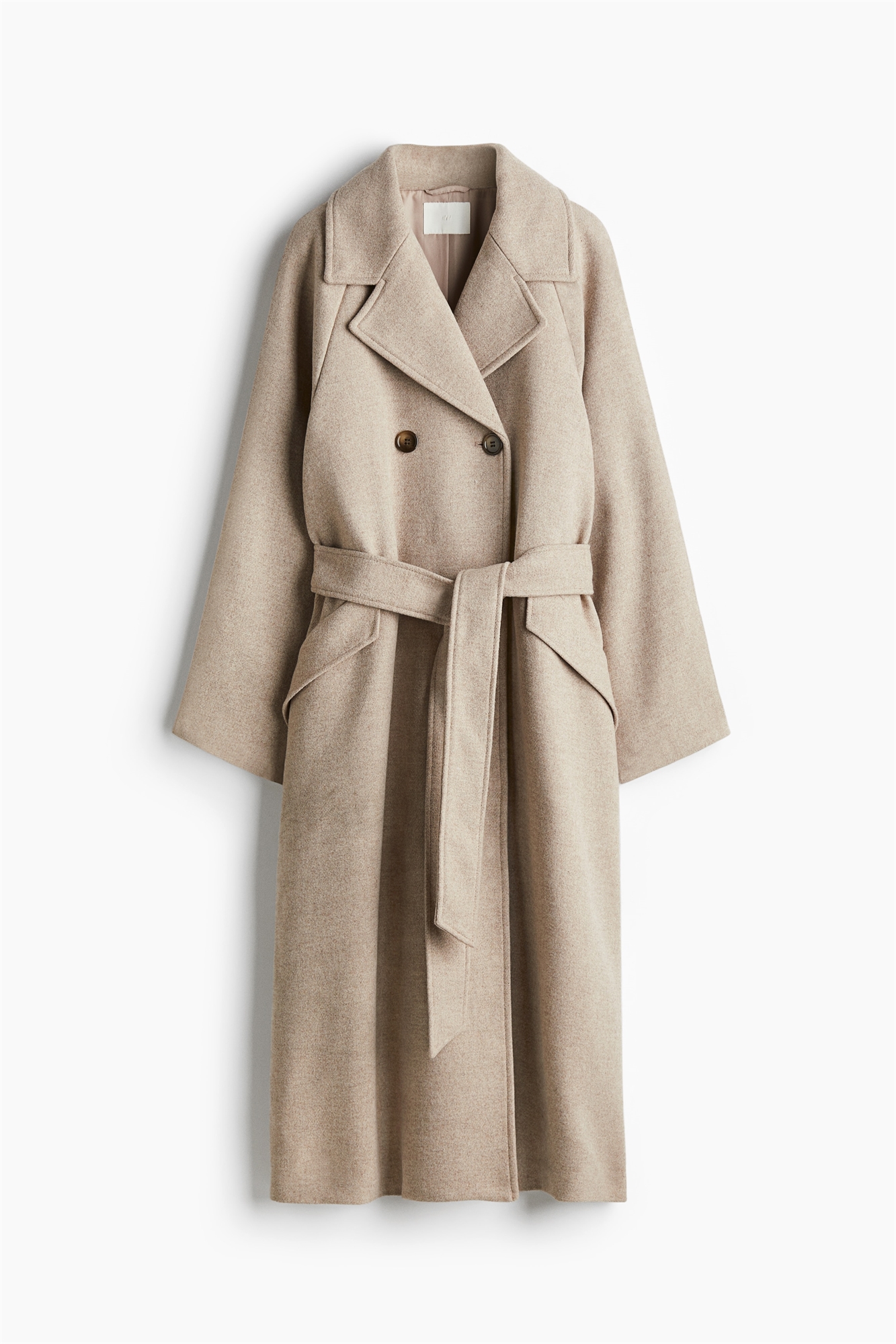 Двубортное пальто из войлока с лацканами с вырезом и пуговицами спереди. Рукава реглан, накладные передние карманы и съемный пояс на талии. Одиночная вентиляция на спине. На подкладке.