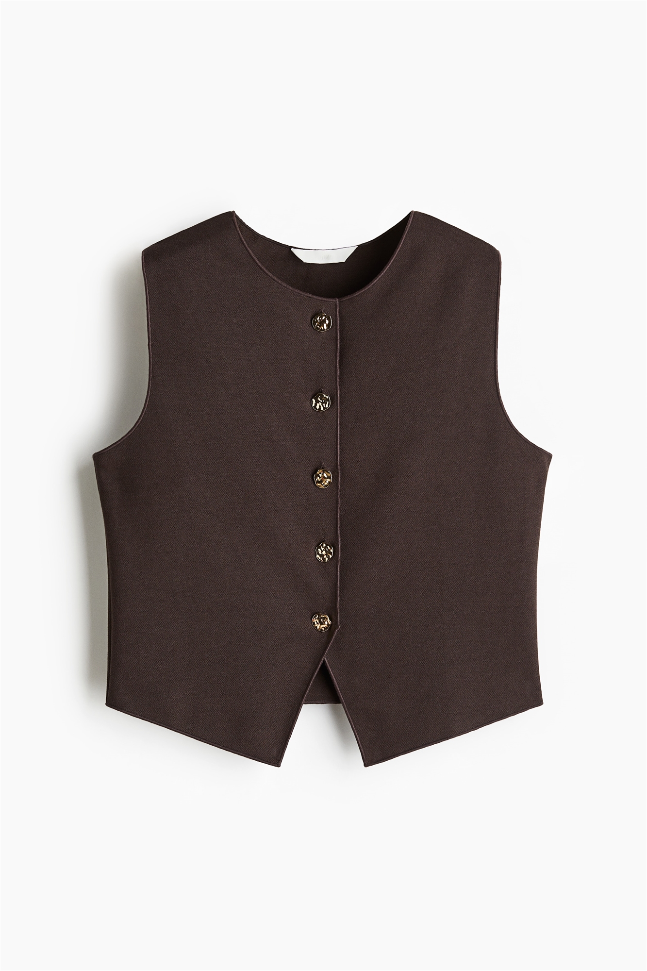 Короткая приталенная жилетка из плотного джерси с оверлочными краями. Круглый вырез и кованые металлические пуговицы спереди.