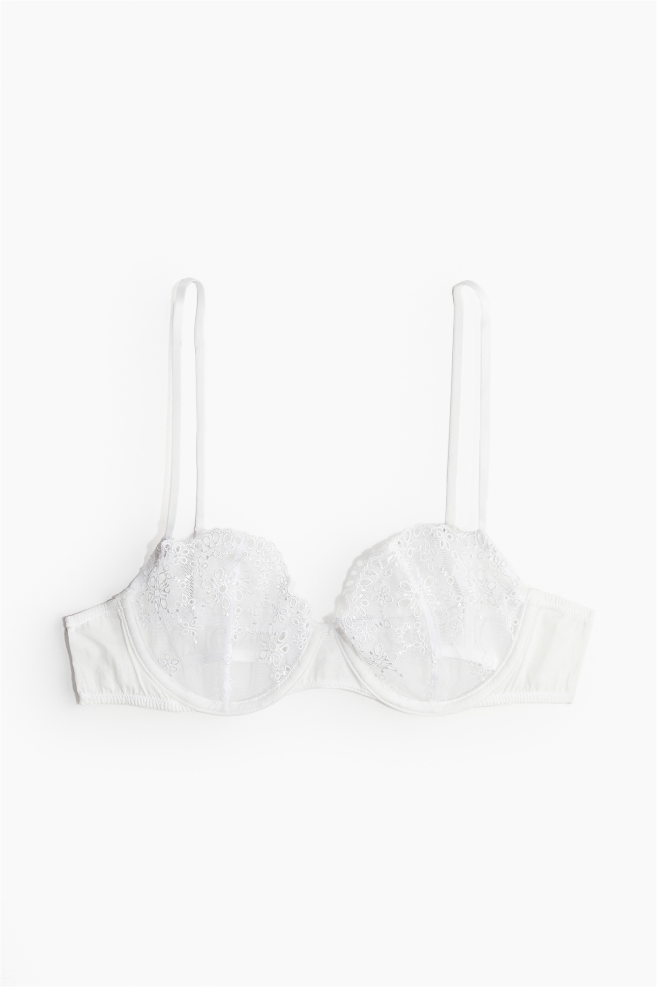 Бюстгальтер без набивки из сетки с рисунком broderie anglaise. Регулируемые бретели и чашечки с заниженной талией, придающие бюсту естественную форму и обеспечивающие легкую поддержку. Застежка на крючки и глазки сзади.