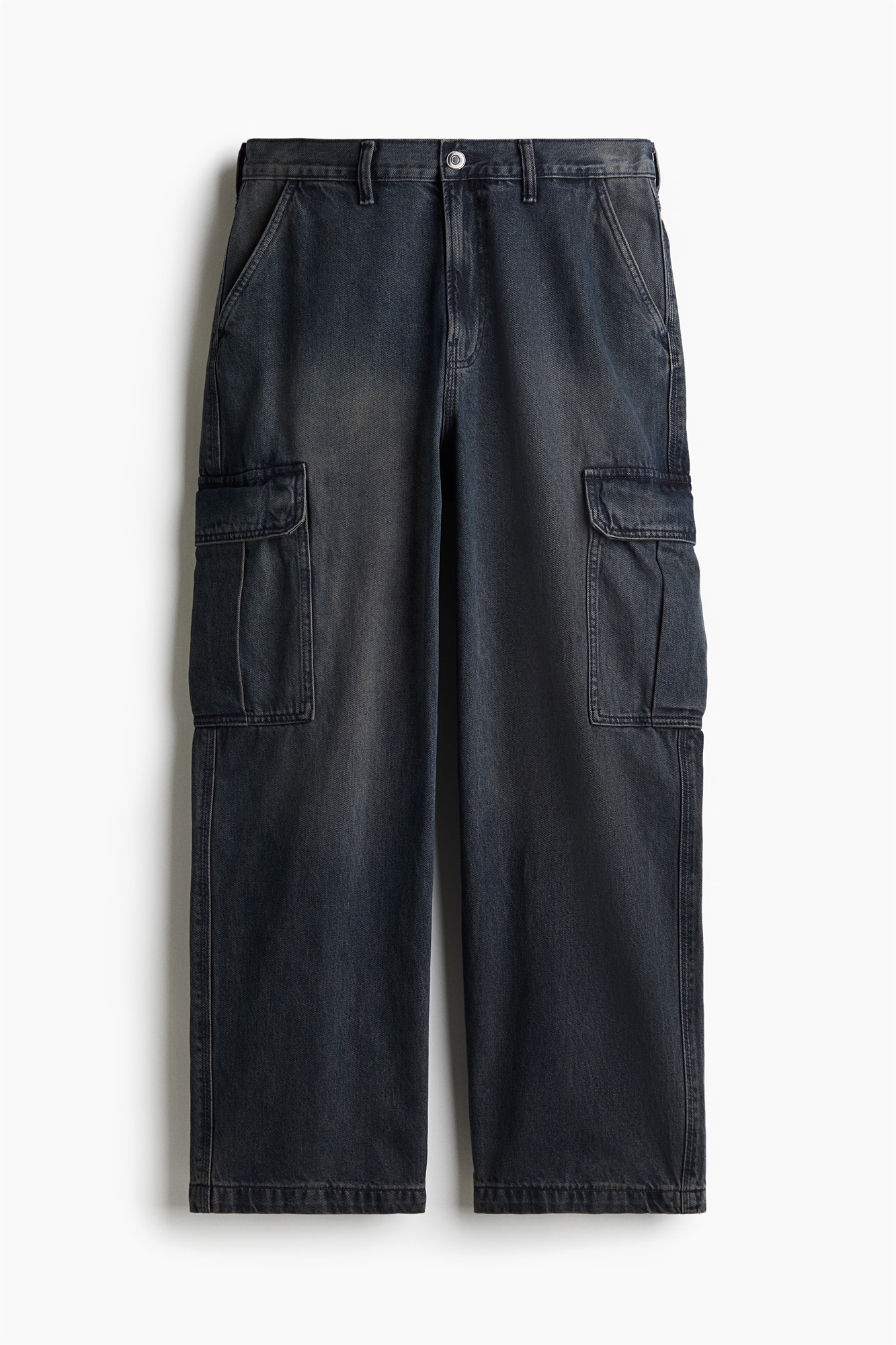 Джинсы карго из жесткого хлопкового денима с диагональными боковыми карманами, открытыми задними карманами и карманами с клапанами на штанинах. Закругленная нога и мешковатый крой от сиденья до подола с большим запасом по всей длине ноги. Заниженная промежность и штанины на лодыжках. Регулярная талия и ширинка на молнии. Предназначены для повседневной носки.