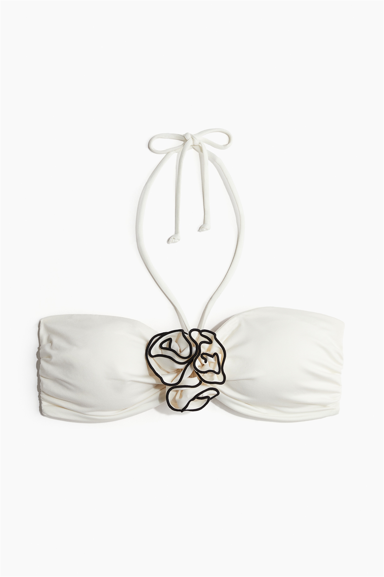 Бикини-бандо на подкладке с оверлочной цветочной аппликацией по центру бюста. Чашечки с мягкой подкладкой придают форму бюсту и обеспечивают хорошую поддержку. Узкие завязки на шее и косточки по бокам придают форму и поддерживают.