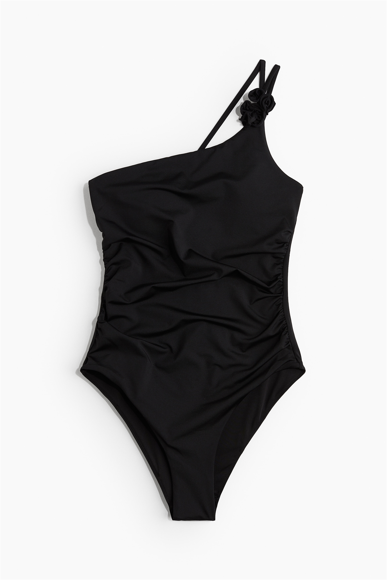 Полностью закрытый купальник на одно плечо с двойной регулируемой бретелью и асимметричным вырезом с цветочными аппликациями спереди. Чашечки со съемными вставками, придающими форму бюсту и обеспечивающими хорошую поддержку. Сборки по бокам, высокие вырезы на ногах и вырез сзади.