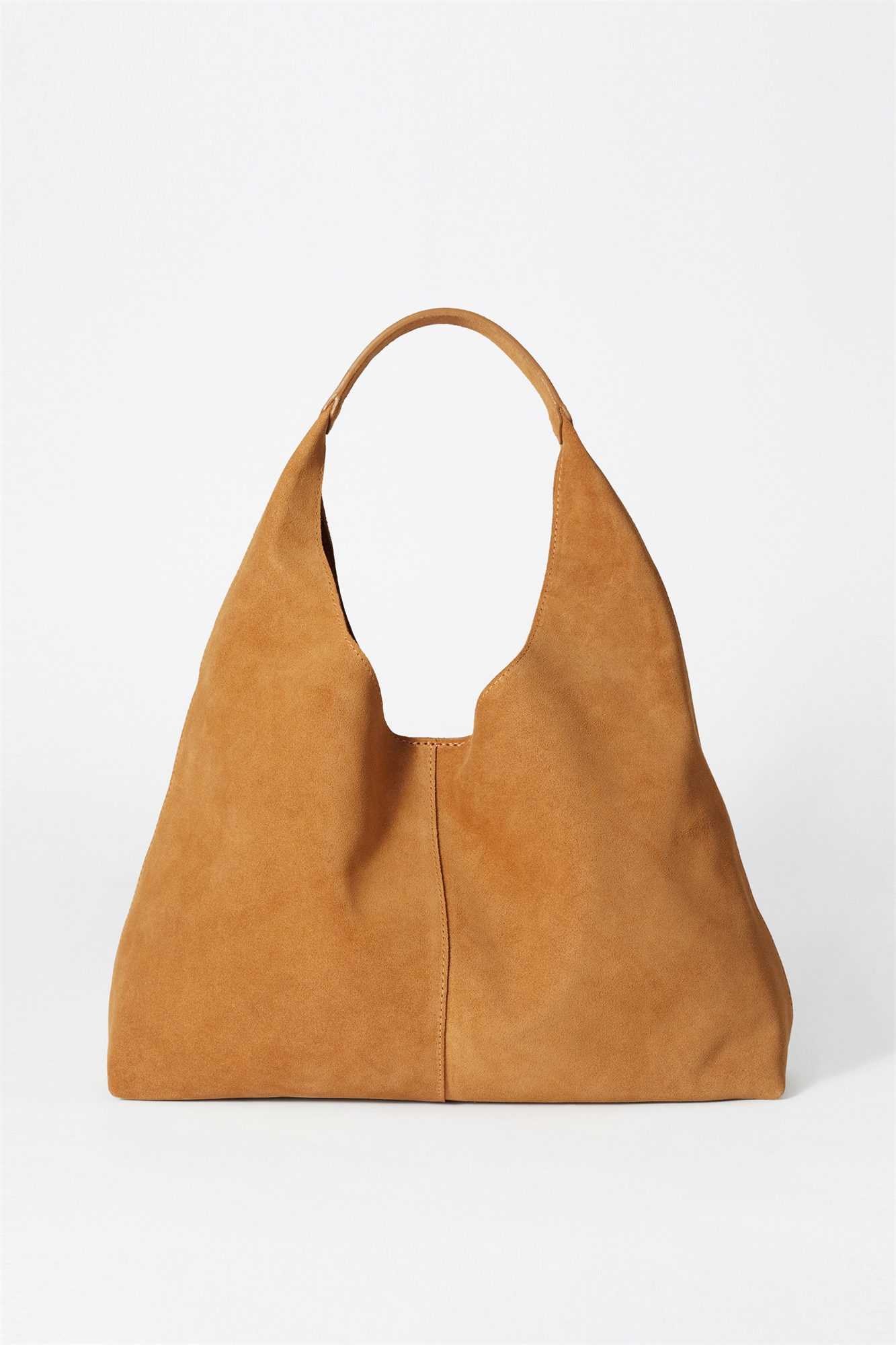 Сумка-торба из гладкой замши с матовой отделкой и декоративным швом посередине. Эта модель оснащена магнитной застежкой и внутренним карманом. Размеры: 37 см x 34 см 14,6" x 13,4"