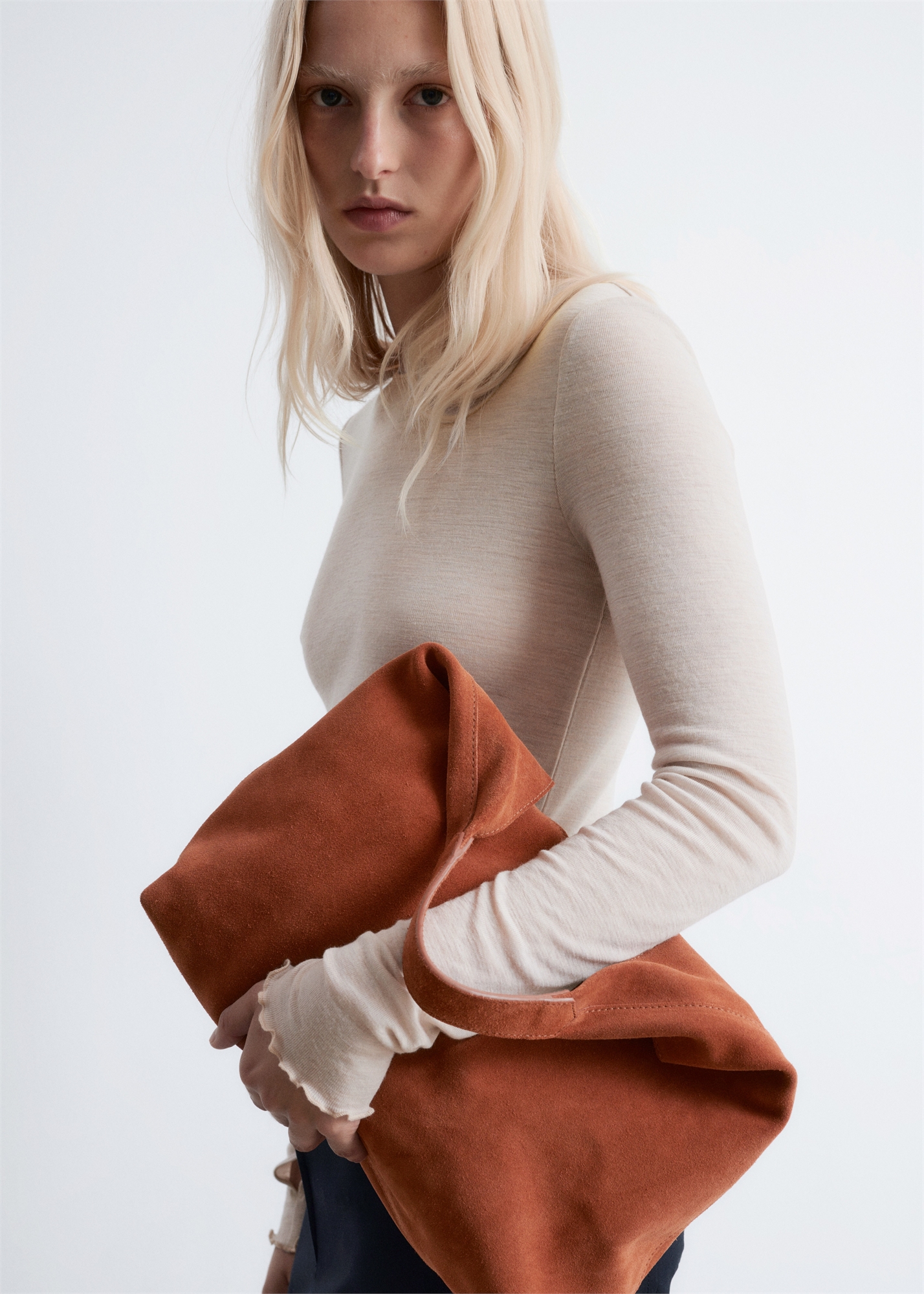 Сумка-торба из гладкой замши с матовой отделкой и декоративным швом посередине. Эта модель оснащена магнитной застежкой и внутренним карманом. Размеры: 37 см x 34 см 14,6" x 13,4"