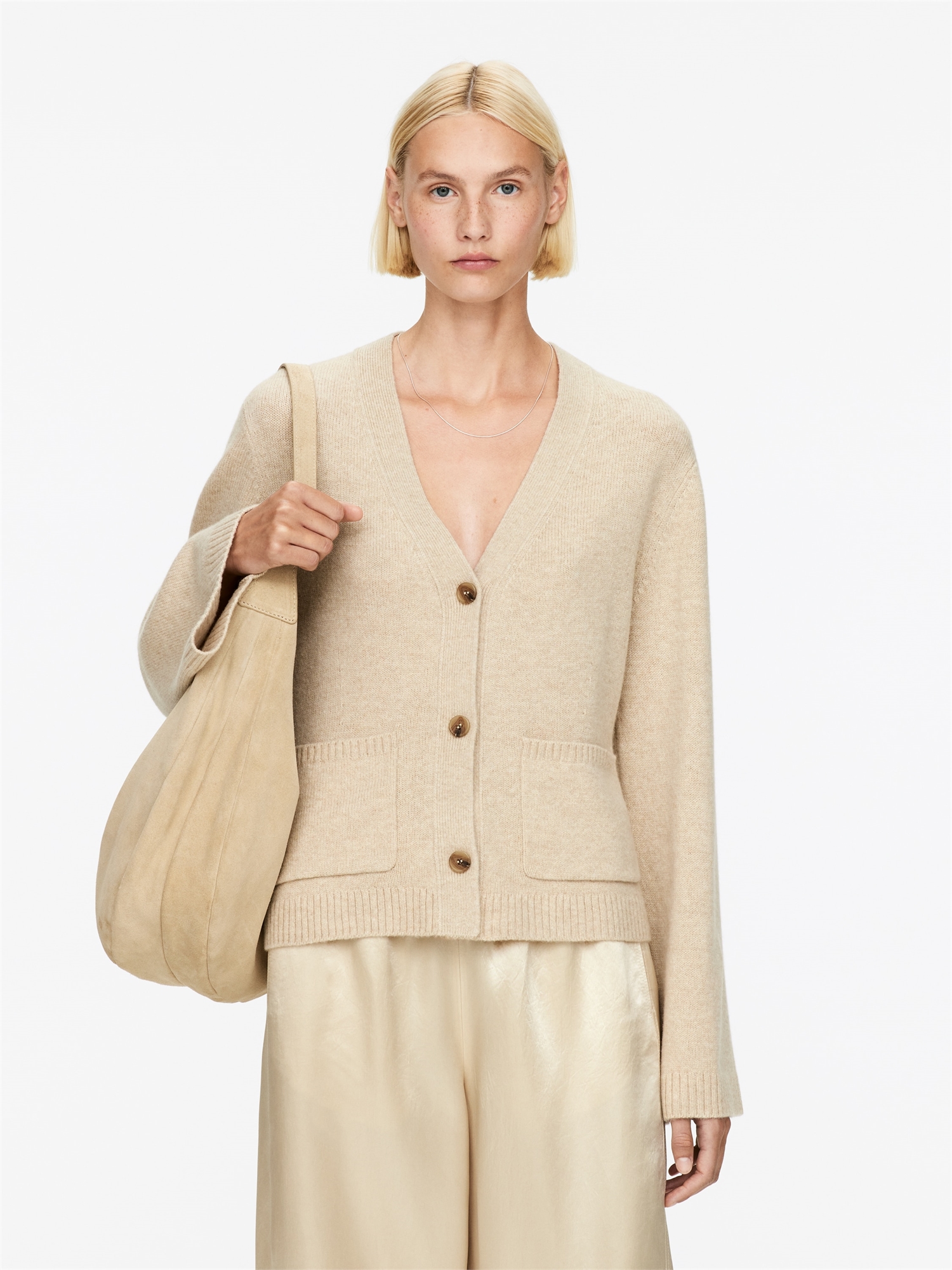 Кардиган с длинными рукавами, V-образным вырезом и застежкой на три пуговицы. Карманы спереди. Зауженный крой. Кардиган содержит 100% шерсти RWS (TE-00047206). Продукция, сертифицированная по стандарту ответственной шерсти (RWS), содержит шерстяное волокно с ферм, прошедших независимую сертификацию на соответствие требованиям по благополучию животных и землепользованию.