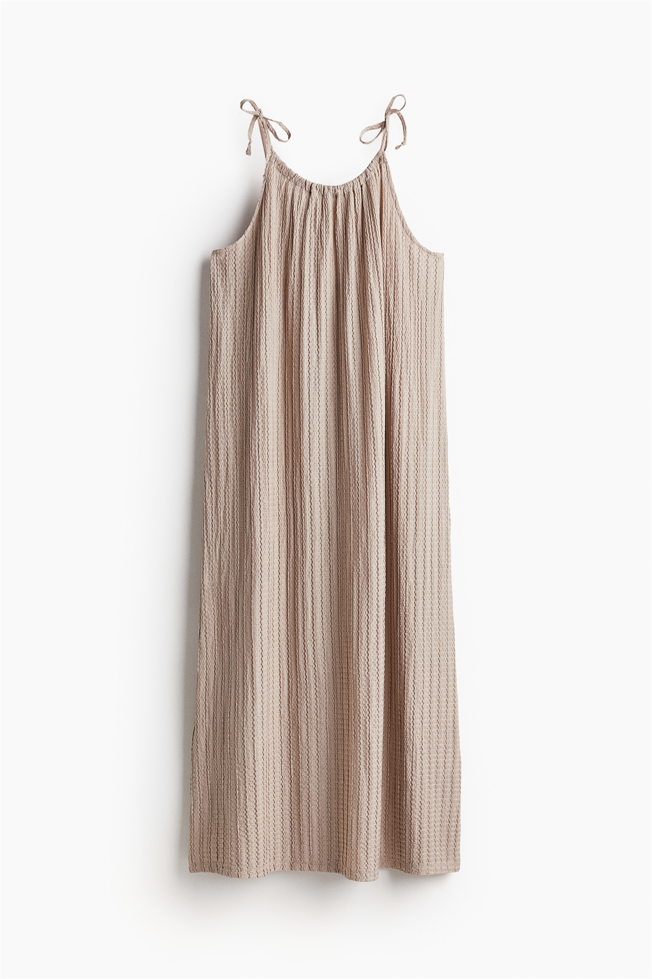 Платье длиной до щиколоток из фактурного джерси, свободный крой и узкие завязки, проходящие через весь верх.