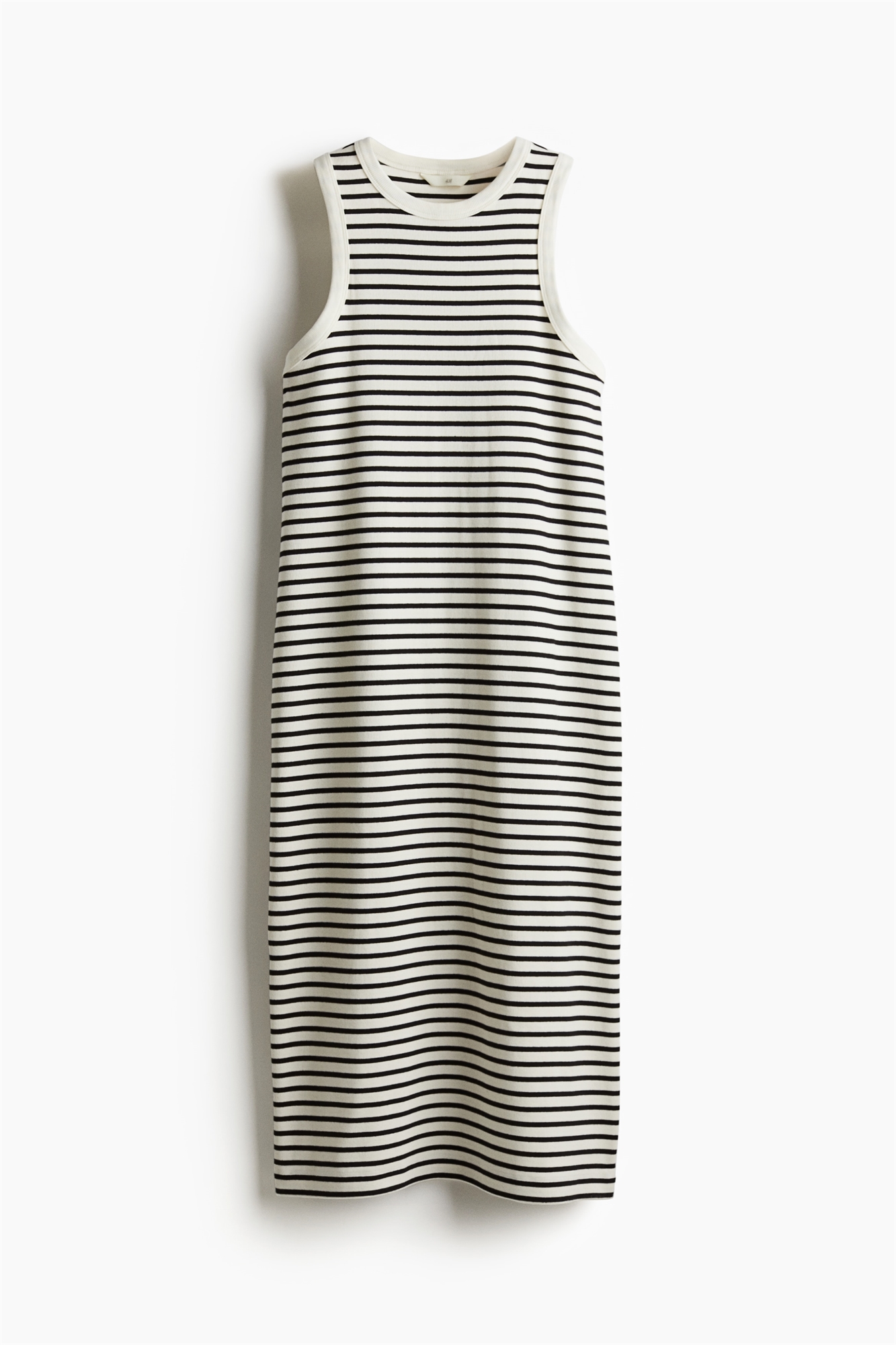 Приталенное платье длиной до колен из ребристого джерси с ребристой отделкой по вырезу горловины и проймам.
