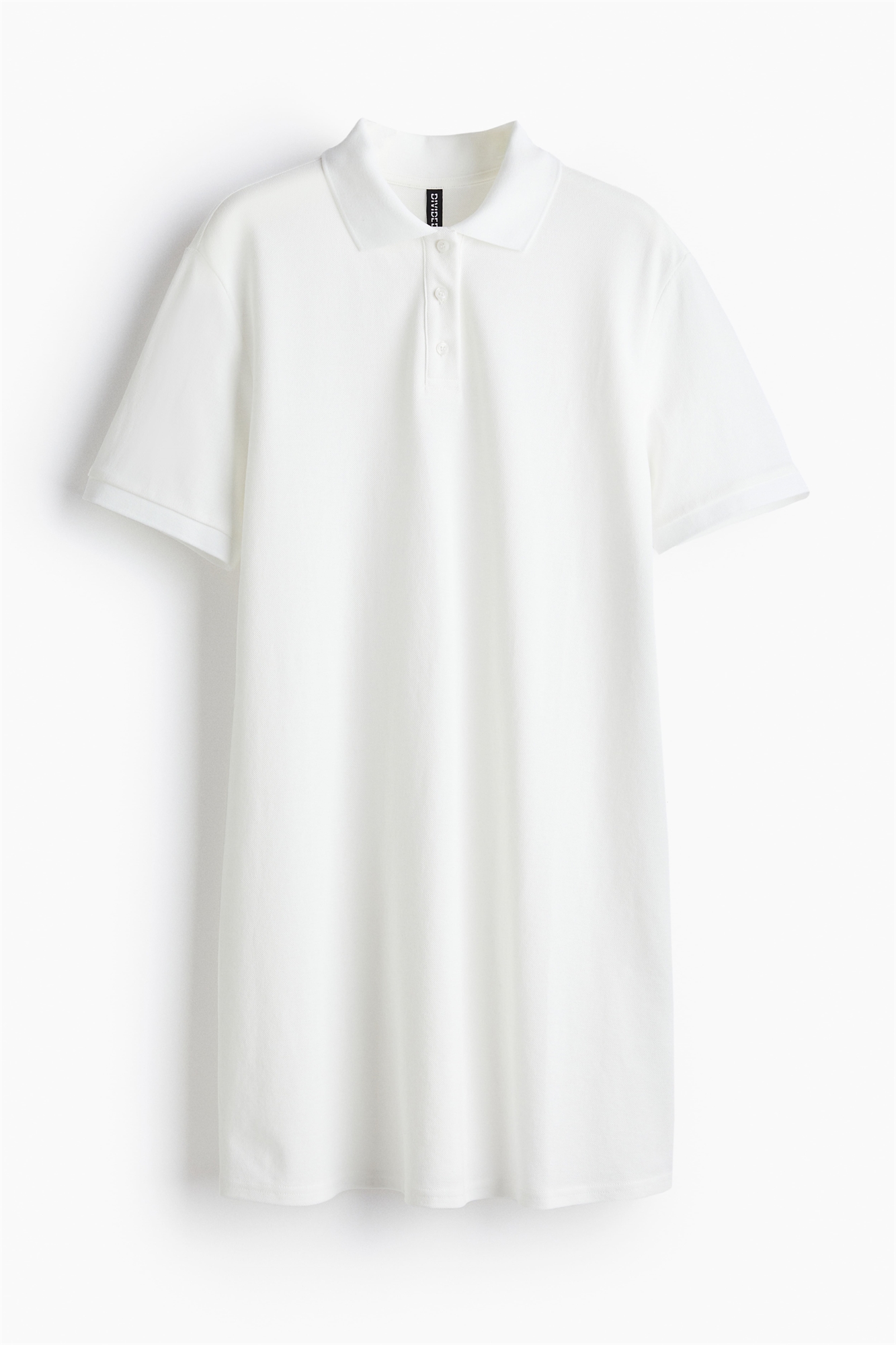 Короткое приталенное платье из хлопкового пике с отложным воротником, застежкой на пуговицы, слегка спущенными плечами и короткими рукавами с манжетами в рубчик. Подол прямого покроя.