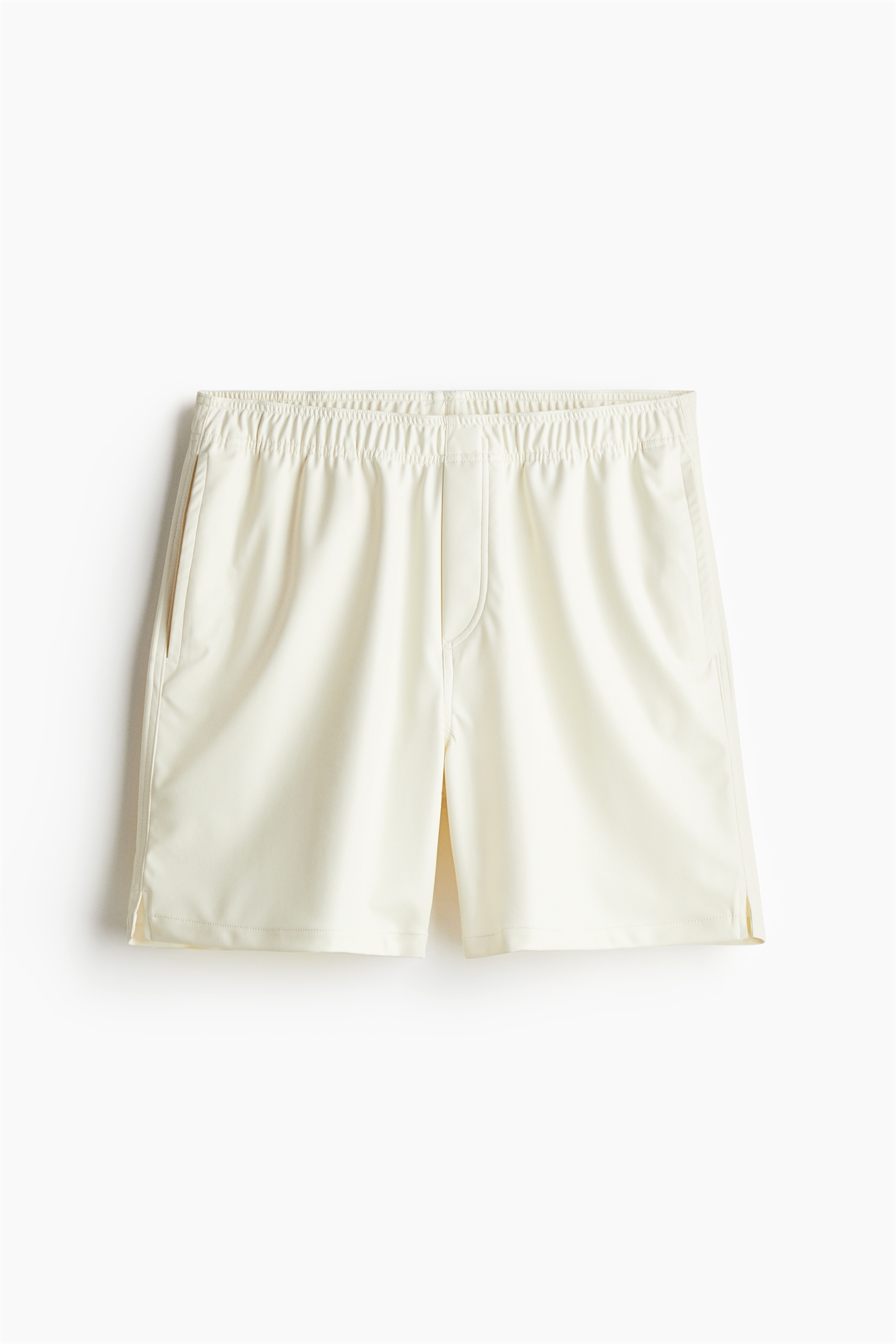 Шорты из мелованной ткани с эластичным покрытием и скрытым шнурком на талии. Фальшивая ширинка, боковые карманы, накладной задний карман и небольшой разрез по бокам по подолу. Свободный крой для непринужденного, но не слишком большого силуэта.