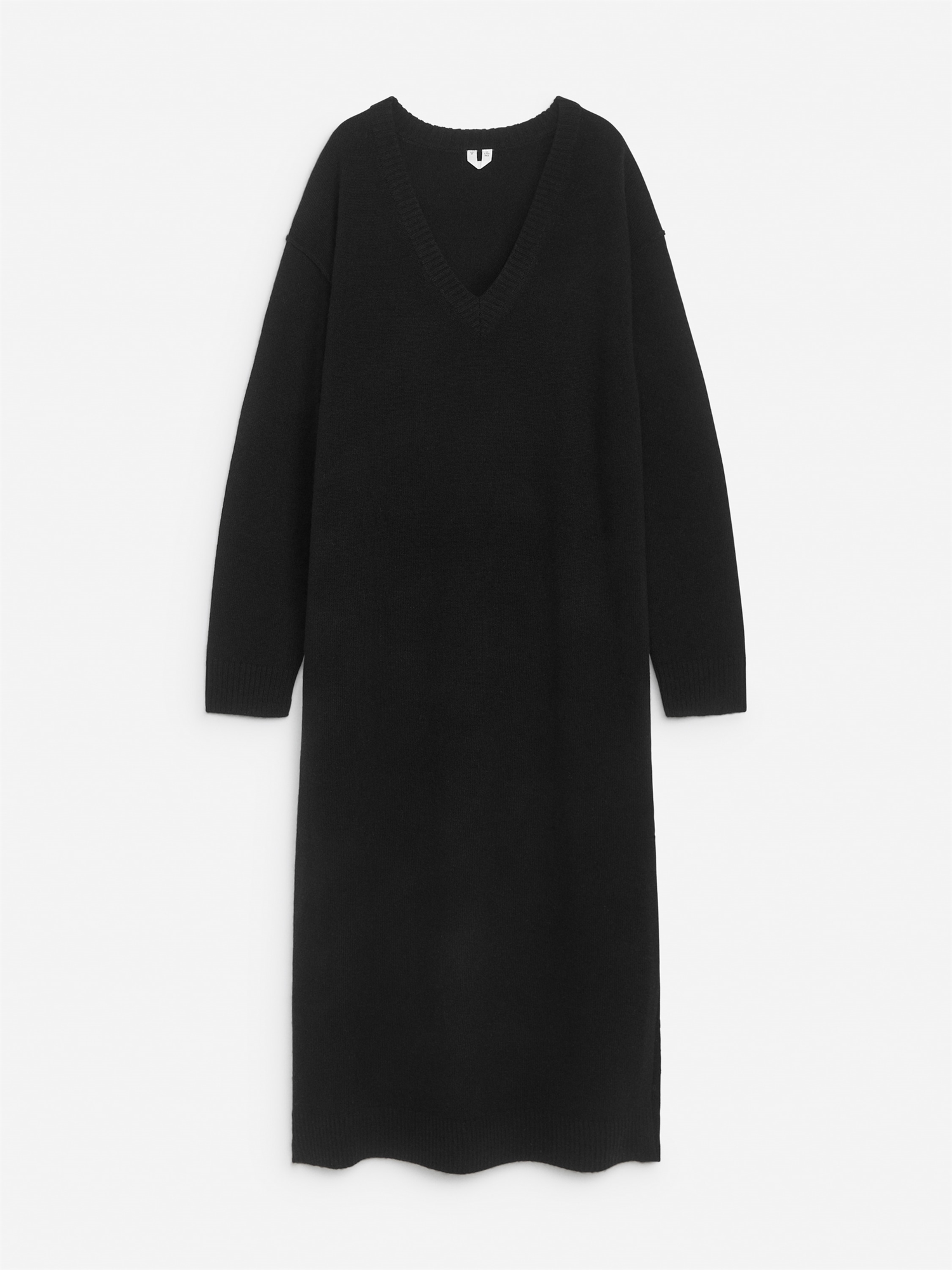 Платье макси с V-образным вырезом из шерсти. Модель с длинными рукавами и прямым силуэтом. Платье содержит 100% шерсти RWS (TE-00047206). Продукция, сертифицированная по стандарту ответственной шерсти (RWS), содержит шерстяное волокно с ферм, прошедших независимую сертификацию на соответствие требованиям по благополучию животных и управлению земельными ресурсами.