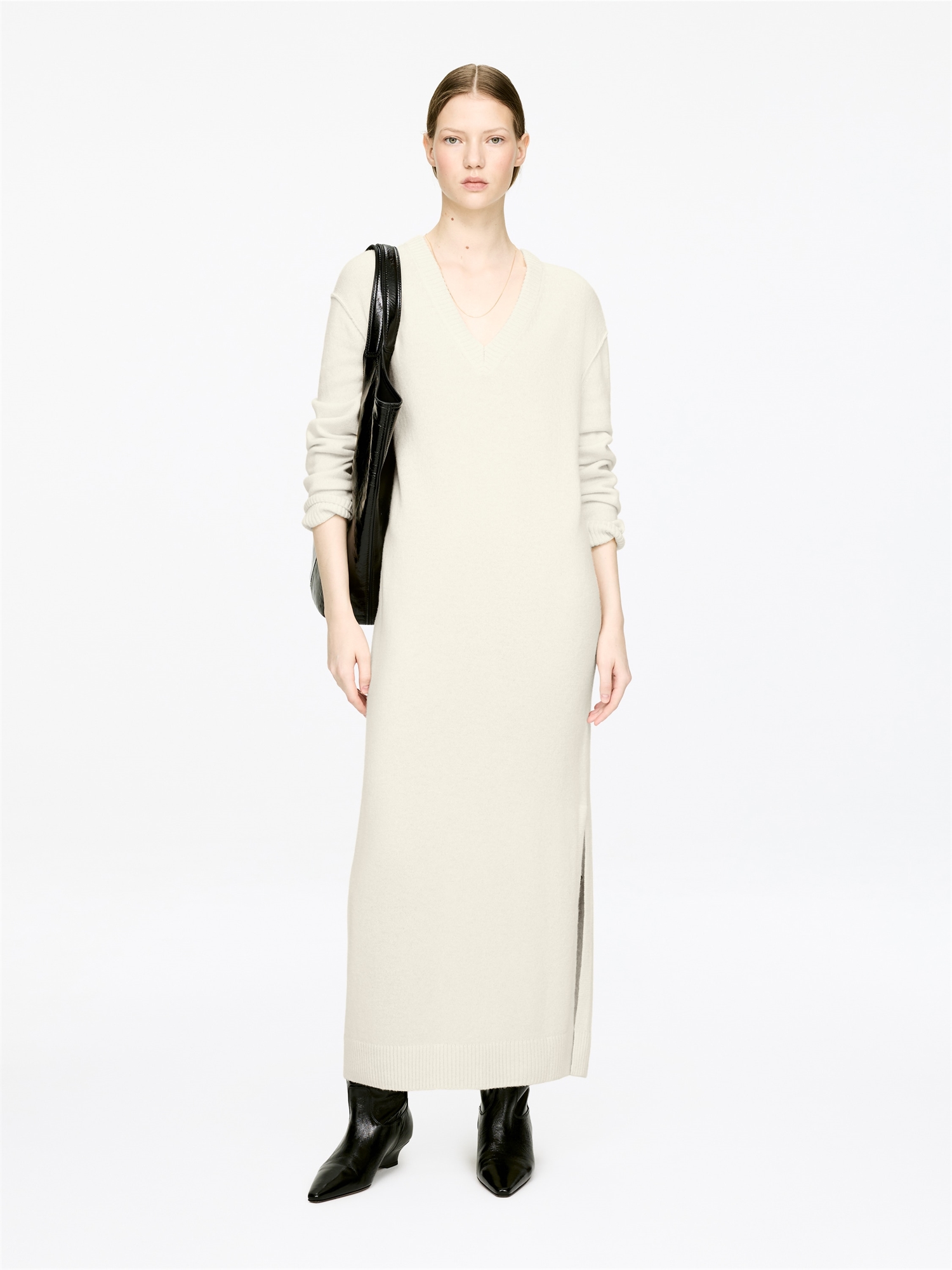 Платье макси с V-образным вырезом из шерсти. Модель с длинными рукавами и прямым силуэтом. Платье содержит 100% шерсти RWS (TE-00047206). Продукция, сертифицированная по стандарту ответственной шерсти (RWS), содержит шерстяное волокно с ферм, прошедших независимую сертификацию на соответствие требованиям по благополучию животных и управлению земельными ресурсами.