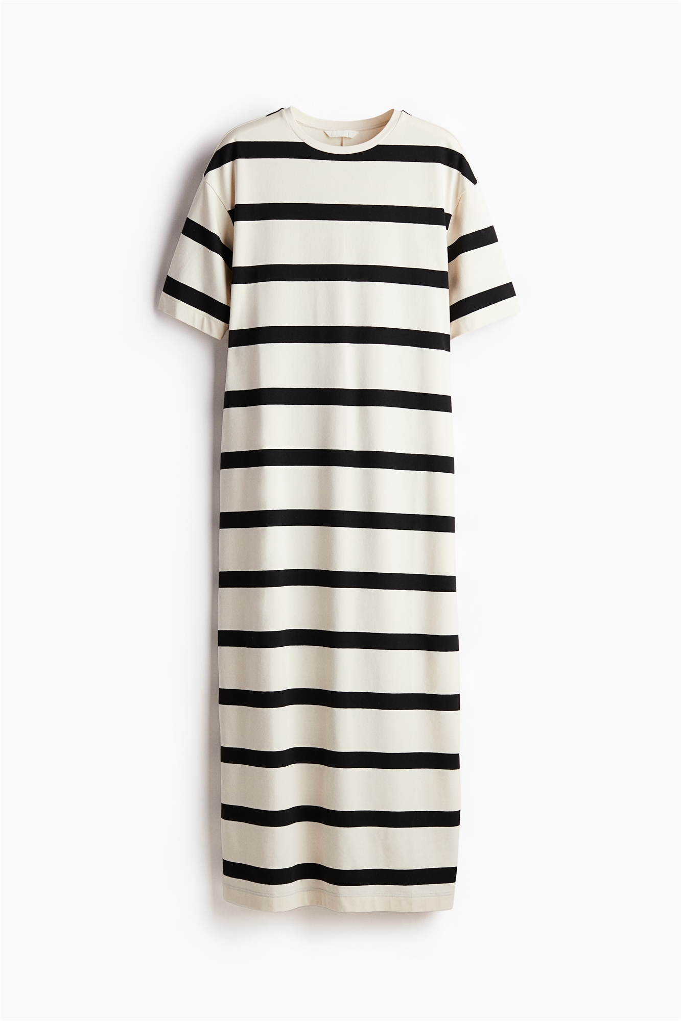 Приталенное платье-футболка длиной до щиколоток из мягкого трикотажа со слегка спущенными плечами и прямым подолом с разрезом сзади.