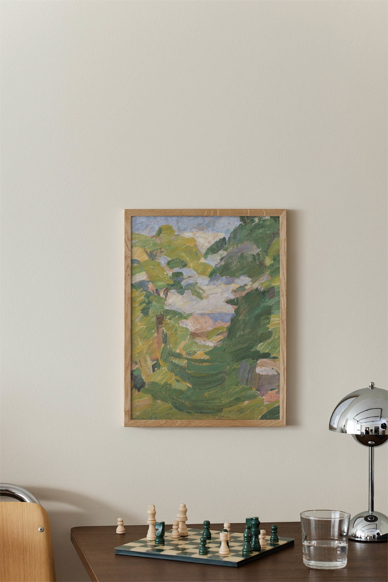 Картина с изображением дубовой рощи, создающей пышное зеленое полотно под мягким облачно-голубым небом. Этот постер передает спокойствие солнечного дня, приглашая вас насладиться успокаивающими оттенками природы.