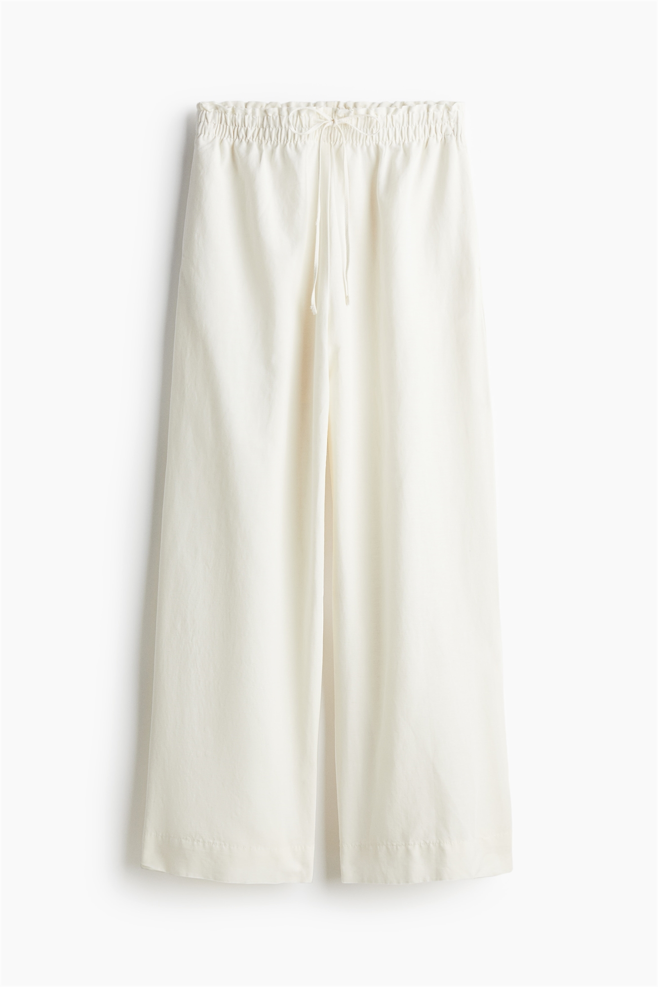 Свободные брюки с воздушным плетением из смеси льна. Высокая талия с эластичным швом, узким шнурком и небольшой оборкой. Небрежные боковые карманы и широкие штанины длиной до щиколотки.