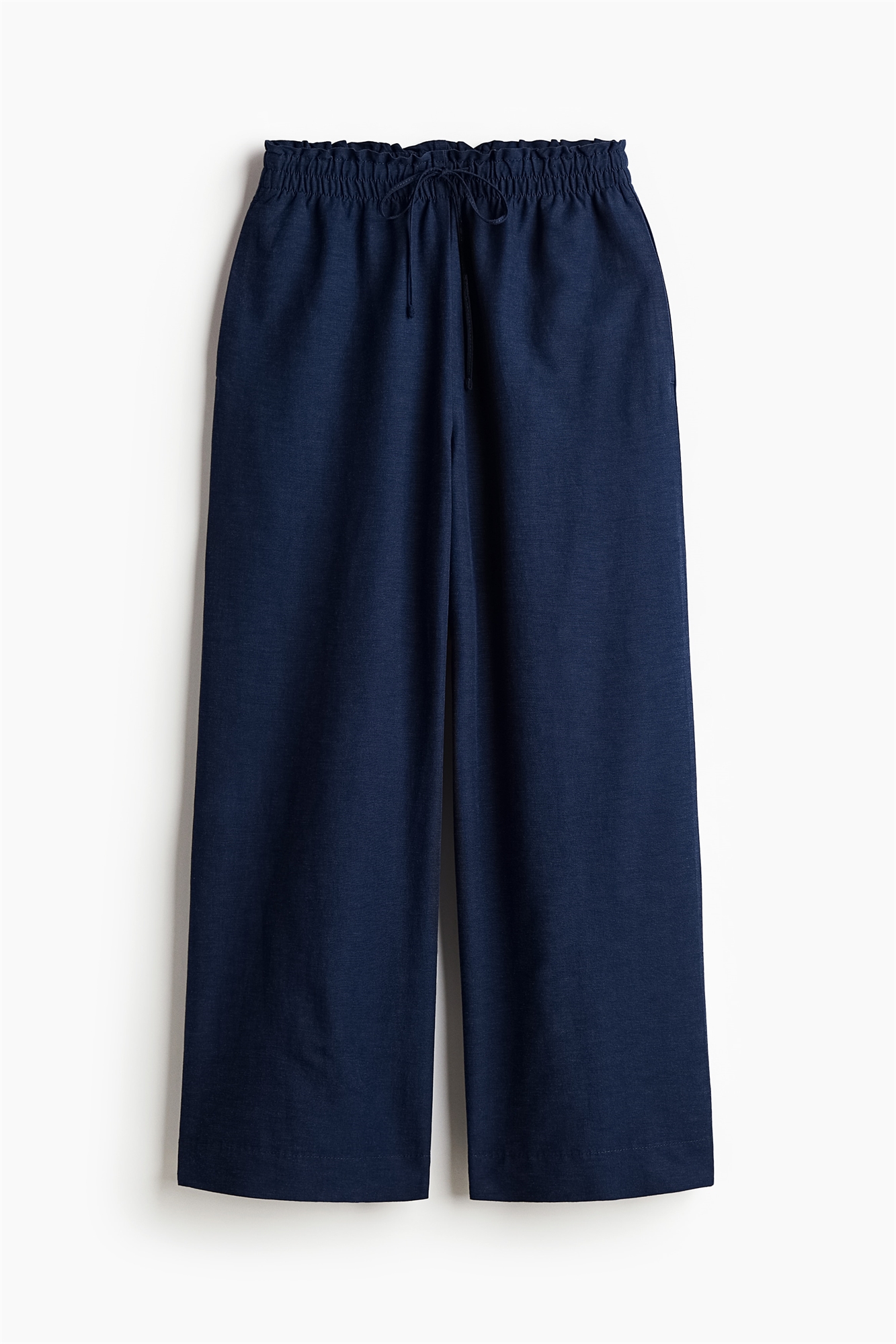 Свободные брюки с воздушным плетением из смеси льна. Высокая талия с эластичным швом, узким шнурком и небольшой оборкой. Небрежные боковые карманы и широкие штанины длиной до щиколотки.